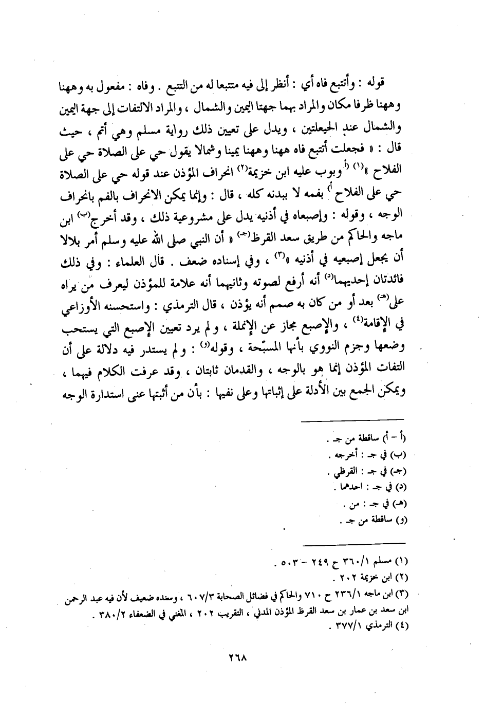قوله: وأتتبع فاه أي: أنظر إلى فيه متتبعا له من التتبع. وفاه: مفعول به وهاهنا وهاهنا ظرفا مكان والمراد بهما جهتا اليمين والشمال، والمراد الالتفات إلى جهة اليمين والشمال عند الحيعلتين، ويدل على تعيين ذلك رواية مسلم وهي أتم، حيث قال: "فجعلت أتتبع فاه هاهنا وهاهنا يمينا وشمالا يقول حي على الصلاة حي على الفلاح" (¬1) (أوبوب عليه ابن خزيمة (¬2) انحراف المؤذن عند قوله حي على الصلاة حي على الفلاح أ) بفمه لا ببدنه كله، قال: وإنما يمكن الانحراف بالفم بانحراف الوجه، وقوله: وإصبعاه في أذنيه يدل على مشروعية ذلك، وقد أخرج (ب) ابن ماجه. والحاكم من طريق سعد القرظ (جـ) "أن النبي صلى الله عليه وسلم أمر بلالا أن يجعل إصبعيه في أذنيه" (¬3)، وفي إسناده ضعف. قال العلماء: وفي ذلك فائدتان إحديهما (د) أنه أرفع لصوته وثانيهما أنه علامة للمؤذن ليعرف من يراه على (هـ) بعد أو من كان به صمم أنه يؤذن، قال الترمذي: واستحسنه الأوزاعي في الإقامة (¬4)، والإصبع مجاز عن الإنملة، ولم يرد تعيين الإصبع التي يستحب وضعها وجزم النووي بأنها المسبّحة، وقوله (و): ولم يستدر فيه دلالة على أن التفات المؤذن إنما هو بالوجه، والقدمان ثابتان، وقد عرفت الكلام فيهما، ويمكن الجمع بين الأدلة على إثباتها وعلى نفيها: بأن من أثبتها عنى استدارة الوجه