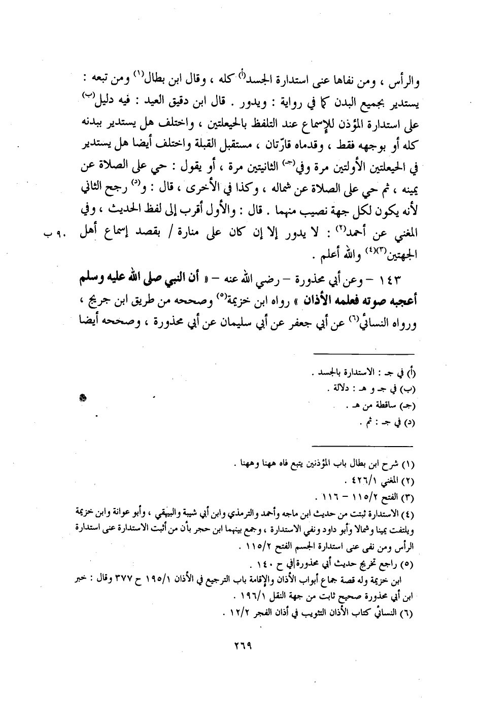 143 - وعن أبي محذورة -رضي الله عنه - "أن النبي صلى الله عليه وسلم أعجبه صوته فعلمه الأذان" رواه ابن خزيمة (¬5) وصححه من طريق ابن جريج، ورواه النسائي (¬6) عن أبي جعفر عن أبي سليمان عن أبي محذورة، وصححه أيضًا