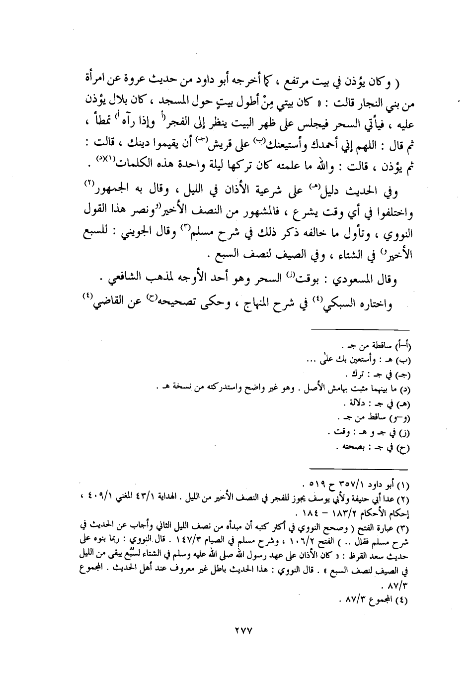 (¬3) عبارة الفتح (وصحح النووي في أكثر كتبه أن مبدأه من نصف الليل الثاني وأجاب عن الحديث في شرح مسلم فقال ..) الفتح 2/ 106، وشرح مسلم في الصيام 3/ 147. قال النووي: ربما ينوه على حديث سعد القرظ: "كان الأذان على عهد رسول الله صلى الله عليه وسلم في الشتاء لسُبُع يبقى من الليل في الصيف لنصف السبع". قال النووي: هذا الحديث باطل غير معروف عند أهل الحديث. المجموع 3/ 87.