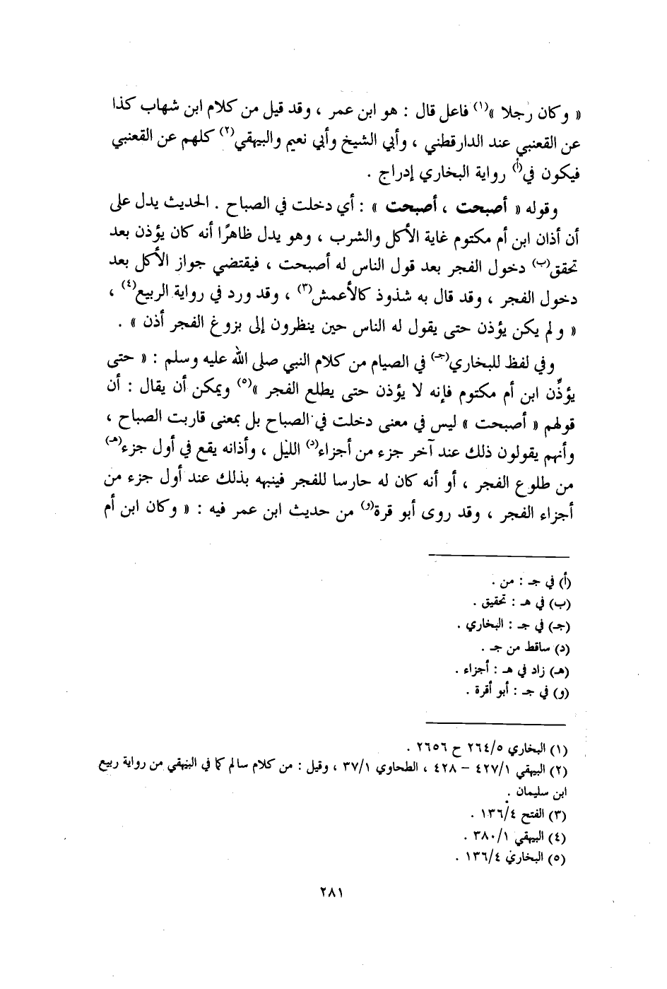 وفي لفظ للبخاري (جـ) في الصيام من كلام النبي صلى الله عليه وسلم: "حتى يؤذِّن ابن أم مكتوم فإنه لا يؤذن حتى يطلع الفجر" (¬5) ويمكن أن يقال: أن قولهم "أصبحت" ليس في معنى دخلت في الصباح بل بمعنى قاربت الصباح، وأنهم يقولون ذلك عند آخر جزء من أجزاء (د) الليل، وأذانه يقع في أول جزء (هـ) من طلوع الفجر، أو أنه كان له حارسا للفجر فينبهه بذلك عند أول جزء من أجزاء الفجر، وقد روى أبو قرة (و) من حديث ابن عمر فيه: "وكان ابن أم