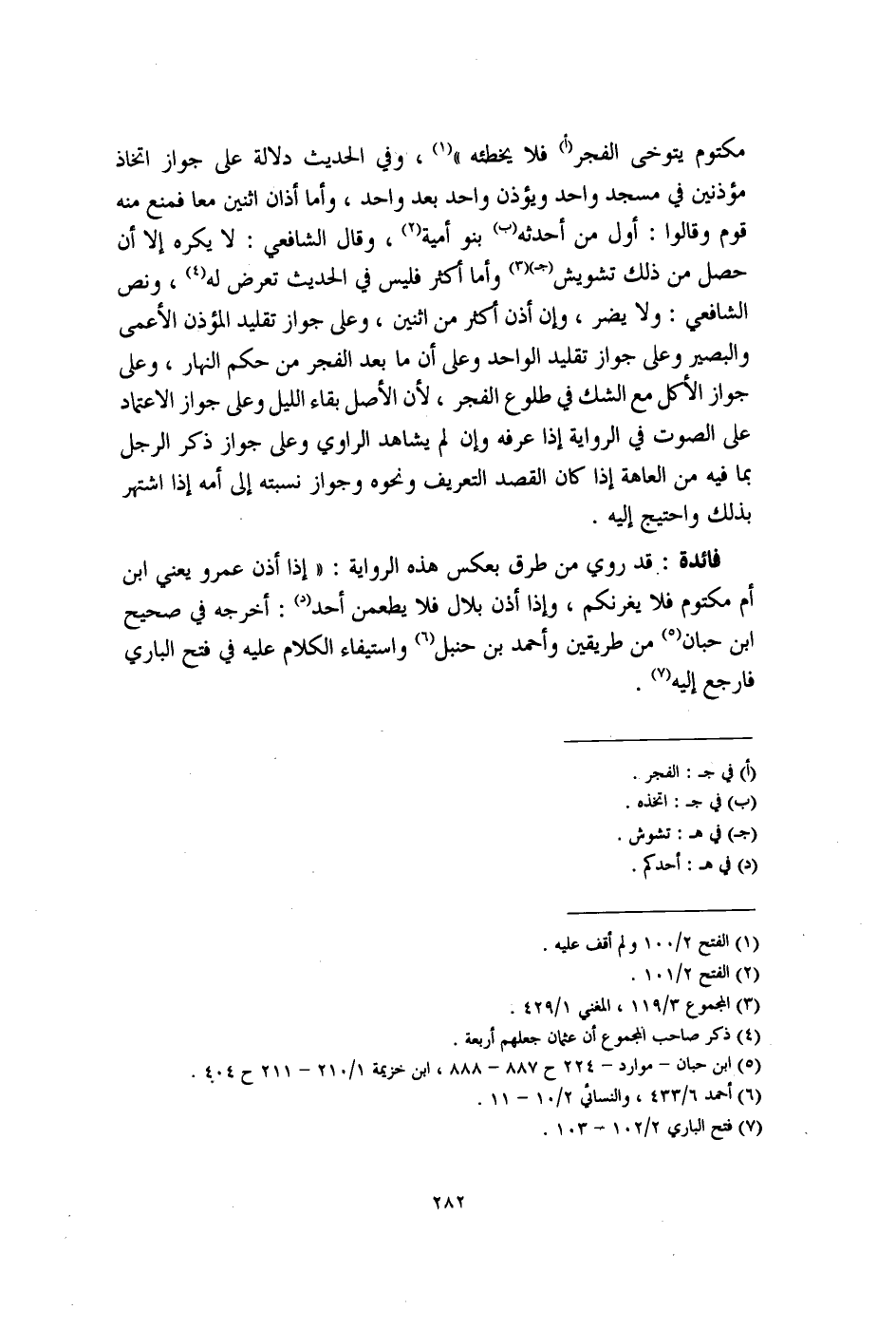 فائدة: قد روي من طرق بعكس هذه الرواية: "إذا أذن عمرو يعني ابن أم مكتوم فلا يغرنكم، وإذا أذن بلال فلا يطعمن أحد (د): أخرجه في صحيح ابن حبان (¬5) من طريقين وأحمد بن حنبل (¬6) واستيفاء الكلام عليه في فتح الباري فارجع إليه (¬7).