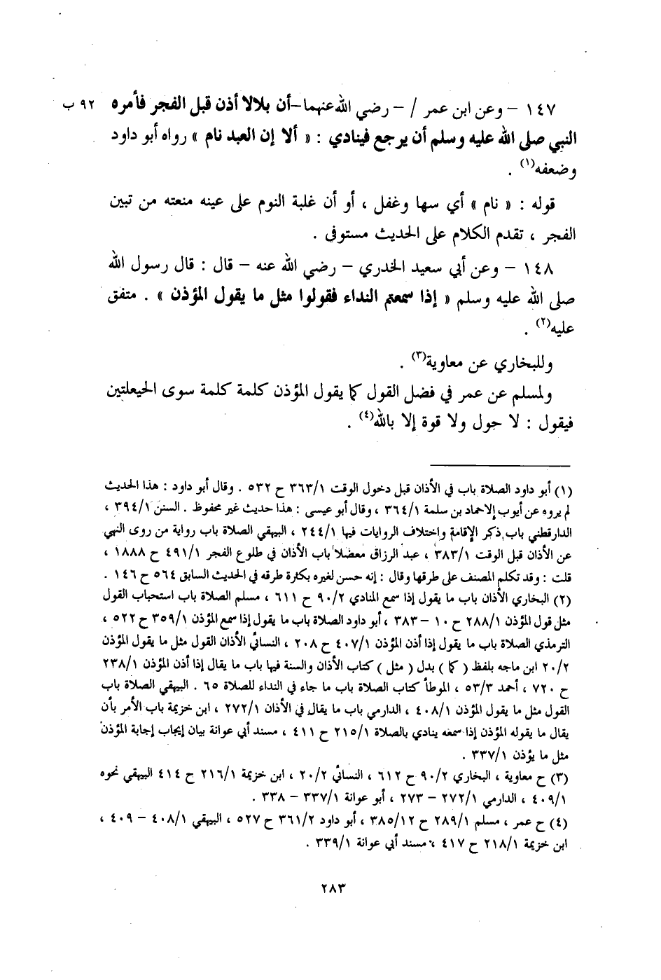 148 - وعن أبي سعيد الخدري - رضي الله عنه - قال: قال رسول الله صلى الله عليه وسلم "إذا سمعتم النداء فقولوا مثل ما يقول المؤذن". متفق عليه (¬2).