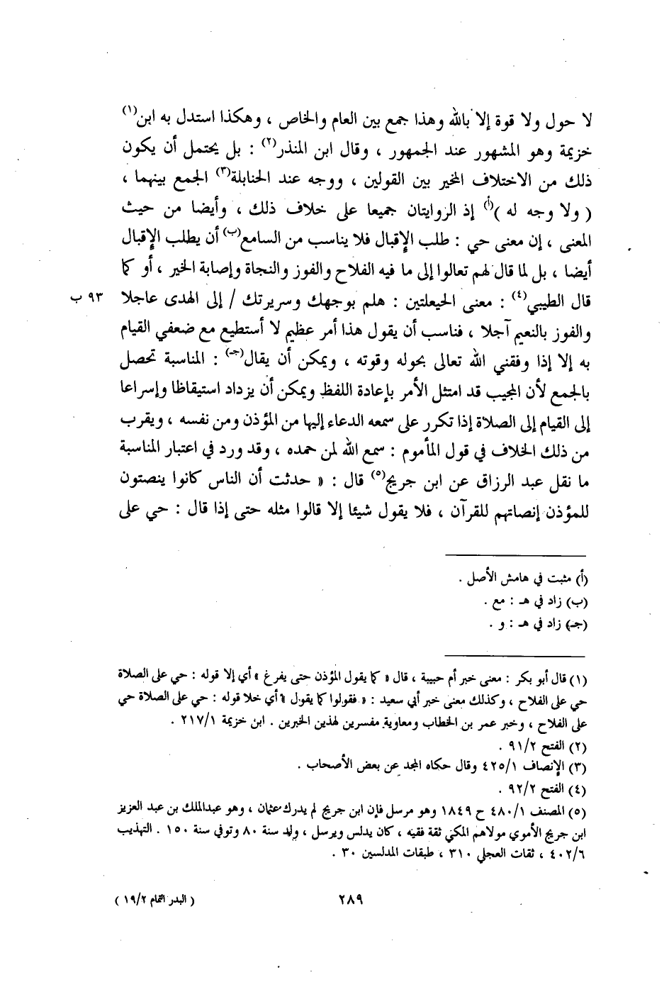 لا حول ولا قوة إلا بالله وهذا جمع بين العام والخاص، وهكذا استدل به ابن (¬1) خزيمة وهو المشهور عند الجمهور، وقال ابن المنذر (¬2): بل يحتمل أن يكون ذلك من الاختلاف المخير بين القولين، ووجه عند الحنابلة (¬3) الجمع بينهما، (ولا وجه له) (أ) إذ الروايتان جميعا على خلاف ذلك، وأيضًا من حيث المعنى، إن معنى حي: طلب الإقبال فلا يناسب من السامع (ب) أن يطلب الإقبال أيضًا، بل لما قال لهم تعالوا إلى ما فيه الفلاح والفوز والنجاة وإصابة الخير، أو كما قال الطيبي (¬4): معنى الحيعلتين: هلم بوجهك وسريرتك إلى الهدى عاجلا والفوز بالنعيم آجلا، فناسب أن يقول هذا أمر عظيم لا أستطع مع ضعفي القيام به إلا إذا وفقني الله تعالى بحوله وقوته، ويمكن أن يقال (جـ): المناسبة تحصل بالجمع لأن المجيب قد امتثل الأمر بإعادة اللفظ ويمكن أن يزداد استيقاظا وإسراعا إلى القيام إلى الصلاة إذا تكرر على سمعه الدعاء إليها من المؤذن ومن نفسه، ويقرب من ذلك الخلاف في قول المأموم: سمع الله لمن حمده، وقد ورد في اعتبار المناسبة ما نقل عبد الرزاق عن ابن جريج (¬5) قال: "حدثت أن الناس كانوا ينصتون للمؤذن إنصاتهم للقرآن، فلا يقول شيئًا إلا قالوا مثله حتى إذا قال: حي على