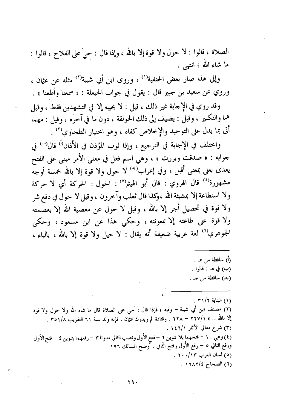 واختلف في الاجابة في الترجيع، وإذا ثوب المؤذن في الأذان (أ) قال (ب) في جوابه: "صدقت وبررت"، وهي اسم فعل في معنى الأمر مبنى على الفتح يعدى بعلى بمعنى أقبل، وفي إعراب (جـ) لا حول ولا قوة إلا بالله خمسة أوجه مشهورة (¬4) قال الهروي: قال. أبو الهيثم (¬5): الحول: الحركة أي لا حركة ولا استطاعة إلا بمشيئة الله، وكذا قال ثعلب وآخرون، وقيل لا حول في دفع شر ولا قوة في تحصيل أجر إلا بالله، وقيل إلا حول عن معصية الله إلا بعصمته ولا قوة على طاعته إلا بمعونته، وحكي هذا عن ابن مسعود، وحكى الجوهري (¬6) لغة عربية ضعيفة أنه يقال: لا حيل ولا قوة إلا بالله، بالياء،