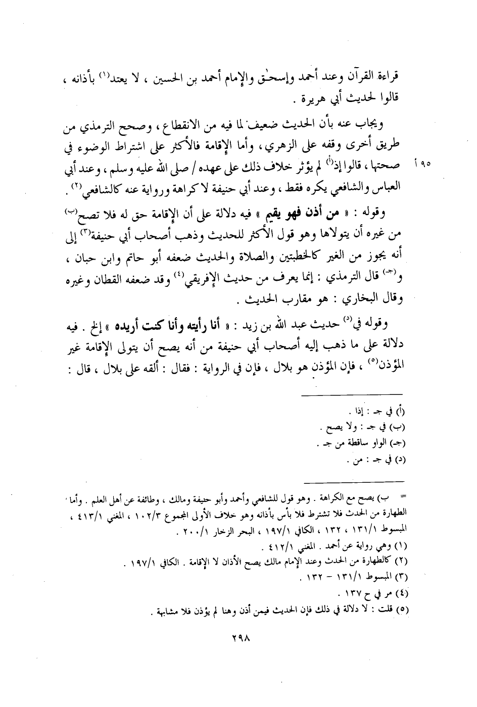 ويجاب عنه بأن الحديث ضعيف لما فيه من الانقطاع، وصحح الترمذي من طريق أخرى وقفه على الزهري، وأما الإِقامة فالأكثر على اشتراط الوضوء في صحتها، قالوا إذ (أ) لم يؤثر خلاف ذلك على عهده صلى الله عليه وسلم، وعند أبي العباس والشافعي يكره فقط، وعند أبي حنيفة لا كراهة ورواية عنه كالشافعي (¬2).