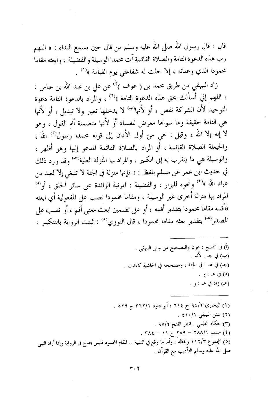 زاد البيهقي من طريق محمد بن (عوف) (أ) عن علي بن عبد الله بن عباس: "اللهم إني أسألك بحق هذه الدعوة التامة" (¬2)، والمراد بالدعوة التامة دعوة التوحيد لأن الشركة نقص، أو لأنها (ب) لا يدخلها تغيير ولا تبديل، أو لأنها هي التامة حقيقة وما سواها معرض للفساد أو لأنها متضمنة أتم القول، وهو لا إله إلا الله، وقيل: هي من أول الأذان إلى قوله محمدا رسول (¬3) الله، والحيعلة الصلاة القائمة، أو المراد بالصلاة القائمة المدعو إليها وهو أظهر، والوسيلة هي ما يتقرب به إلى الكبير، والمراد بها المنزلة العلية (جـ) وقد ورد ذلك في حديث ابن عمر عن مسلم بلفظ: "فإنها منزلة في الجنة لا تنبغي إلا لعبد من عباد الله" (¬4) ونحوه للبزار، والفضيلة: المرتبة الزائدة على سائر الخلق، أو (د) المراد بها منزلة أخرى غير الوسيلة، ومقاما محمودا نصب على المفعولية أي ابعثه فأقمه مقاما محمودا بتقدير أقمه، أو على تضمين ابعث معنى أقم، أو نصب على المصدر (¬5) بتقدير بعثه مقاما محمودا، قال النووي (د): ثبتت الرواية بالتنكير،