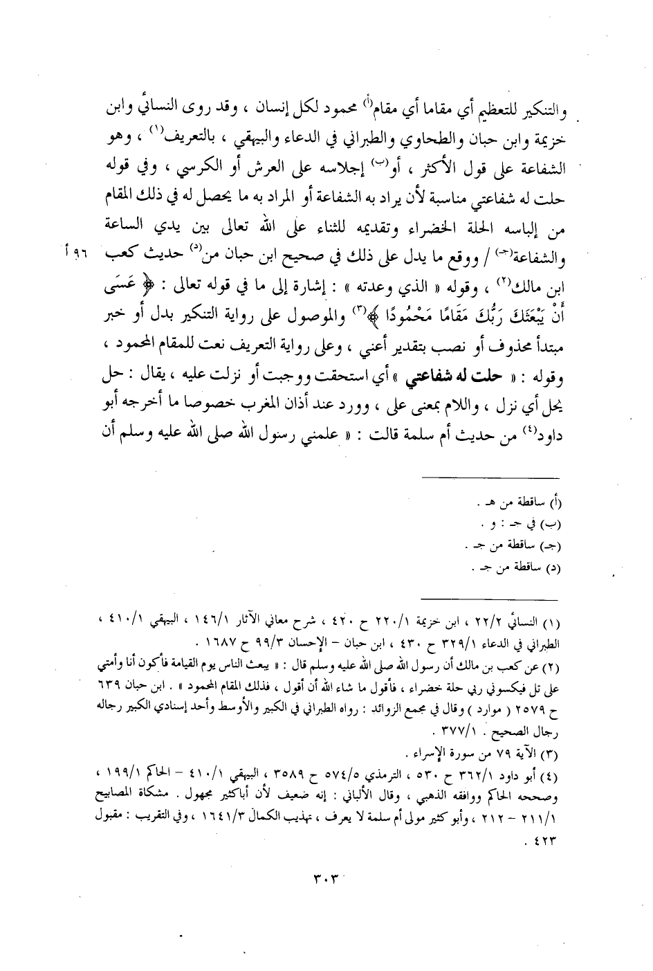 (¬2) عن كعب بن مالك أن رسول الله صلى الله عليه وسلم قال: "يبعث الناس يوم القيامة فأكون أنا وأمتى على تل فيكسوني ربي حلة خضراء، فأقول ما شاء الله أن أقول، فذلك المقام المحمود". ابن حبان 639 ح 2579 (موارد) وقال في مجمع الزوائد: رواه الطبراني في الكبير والأوسط وأحد إسنادي الكبير رجاله رجال الصحيح. 1/ 377.