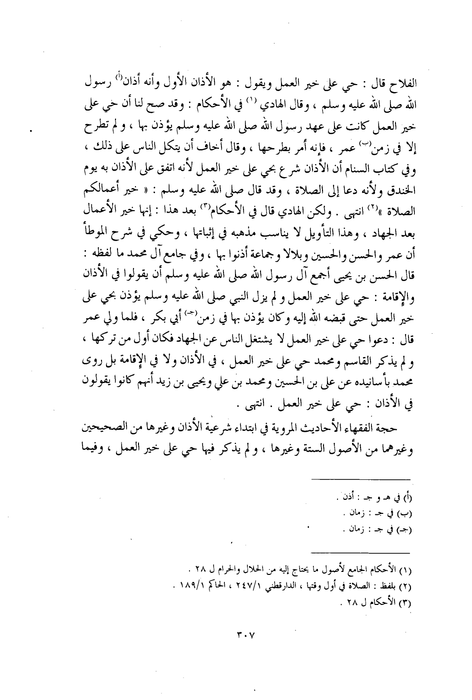 الفلاح قال: حي على خير العمل ويقول: هو الأذان الأول وأنه أذان (أ) رسول الله صلى الله عليه وسلم، وقال الهادي (¬1) في الأحكام: وقد صح لنا أن حي على خير العمل كانت على عهد رسول الله صلى الله عليه وسلم يؤذن بها، ولم تطرح إلا في زمن (ب) عمر، فإنه أمر بطرحها، وقال أخاف أن يتكل الناس على ذلك، وفي كتاب السنام أن الأذان شرع بحي على خير العمل لأنه اتفق على الأذان به يوم الخندق ولأنه دعا إلى الصلاة، وقد قال صلى الله عليه وسلم: "خير أعمالكم الصلاة" (¬2) انتهى. ولكن الهادي قال في الأحكام (¬3) بعد هذا: إنها خير الأعمال بعد الجهاد، وهذا التأويل لا يناسب مذهبه في إثباتها، وحكي في شرح الموطأ أن عمر والحسن والحسين وبلالا وجماعة أذنوا بها، وفي جامع آل محمد ما لفظه: قال الحسن بن يحيى أجمع آل رسول الله صلى الله عليه وسلم أن يقولوا في الأذان والإِقامة: حي على خير العمل ولم يزل النبي صلى الله عليه وسلم يؤذن بحي على خير العمل حتى قبضه الله إليه وكان يؤذن بها في زمن (جـ) أبي بكر، فلما ولي عمر قال: دعوا حي على خير العمل لا يشتغل الناس عن الجهاد فكان أول من تركها، ولم يذكر القاسم ومحمد حي على خير العمل، في الأذان ولا في الإِقامة بل روى محمد بأسانيده عن علي بن الحسين ومحمد بن علي ويحيى بن زيد أنهم كانوا يقولون في الأذان: حي على خير العمل. انتهى.
