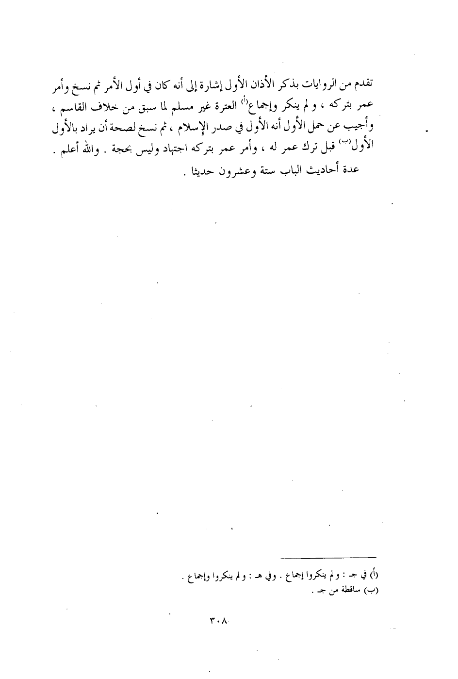 تقدم من الروايات بذكر الأذان الأول إشارة إلى أنه كان في أول الأمر ثم نسخ وأمر عمر بتركه، ولم ينكر وإجماع (أ) العترة غير مسلم لما سبق من خلاف القاسم، وأجيب عن حمل الأول أنه الأول في صدر الإِسلام، ثم نسخ لصحة أن يراد بالأول الأول (ب) قبل ترك عمر له، وأمر عمر بتركه اجتهاد وليس بحجة. والله أعلم.