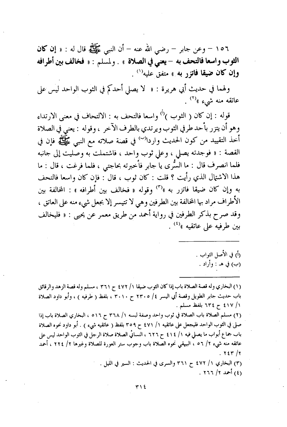 (¬2) مسلم الصلاة باب الصلاة في ثوب واحد وصفة لبسه 1/ 368 ح 516، البخاري الصلاة باب إذا صلى في الثوب الواحد فليجعل على عاتقيه 1/ 471 ح 359 بلفظ (عاتقيه شيء). أبو داود نحوه الصلاة باب جماع أبواب ما يصلى فيه 1/ 414 ح 626، النسائي الصلاة صلاة الرجل الثوب الواحد ليس على عاتقه منه شيء 2/ 56، البيهقي نحوه الصلاة باب وجوب ستر العورة للصلاة وغيرها 2/ 224، أحمد 2/ 243.