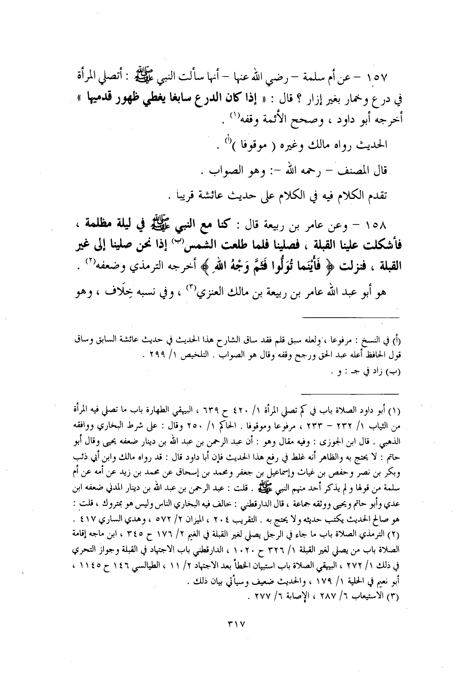 157 - عن أم سلمة - رضي الله عنها - أنها سألت النبي - صلى الله عليه وسلم -: أتصلي المرأة في درع وخمار بغير إزار؟ ذال: "إذا كان الدرع سابغا يغطي ظهور قدميها" أخرجه أبو داود، وصحح الأئمة وقفه (¬1).