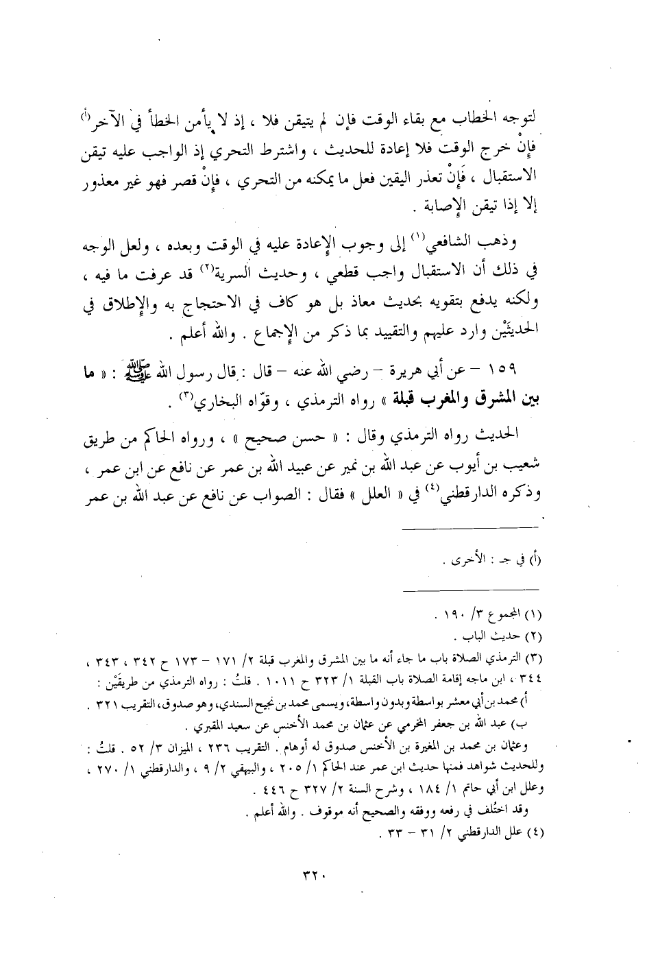 159 - عن أبي هريرة - رضي الله عنه - قال: قال رسول الله - صلى الله عليه وسلم -: "ما بين المشرق والمغرب قبلة" رواه الترمذي، وقوّاه البخاري (¬3).