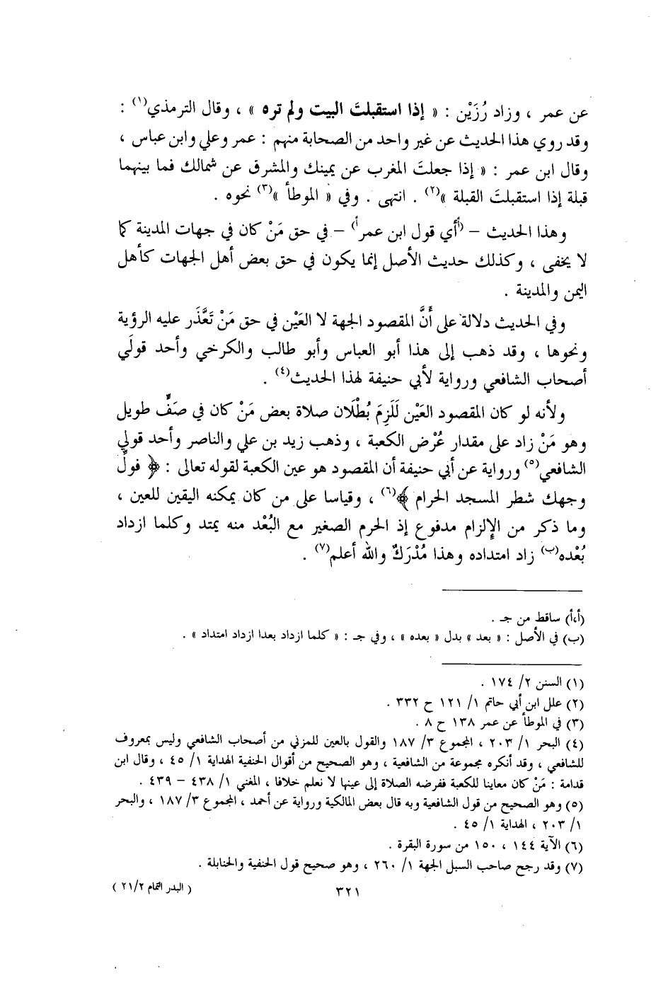 (¬4) البحر 1/ 203، المجموع 3/ 187 والقول بالعين للمزني من أصحاب الشافعي وليس بمعروف للشافعي، وقد أنكره مجموعة من الشافعية، وهو الصحيح من أقوال الحنفية الهداية 1/ 45، وقال ابن قدامة: مَنْ كان معاينا للكعبة ففرضه الصلاة إلى عينها لا نعلم خلافا، المغني 1/ 438 - 439.