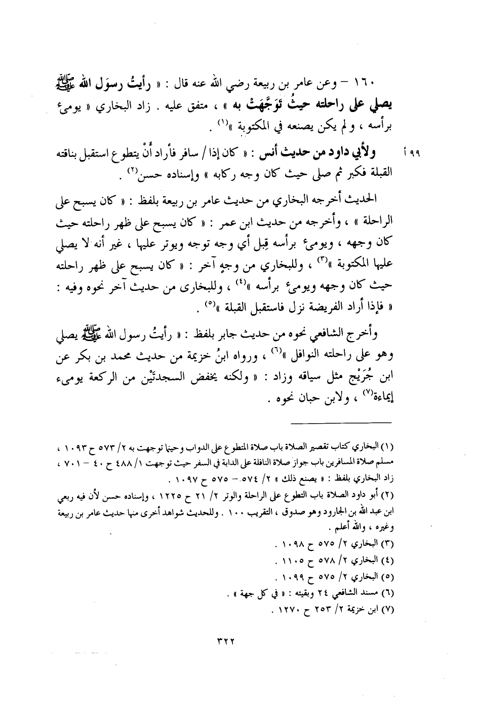 160 - وعن عامرو بن ربيعة رضي الله عنه قال: "رأيتُ رسوَل الله - صلى الله عليه وسلم - يصلي على راحلته حيثُ تَوَجَّهَتْ به"، متفق عليه. زاد البخاري "يومئ برأسه، ولم يكن يصنعه في المكتوبة" (¬1).