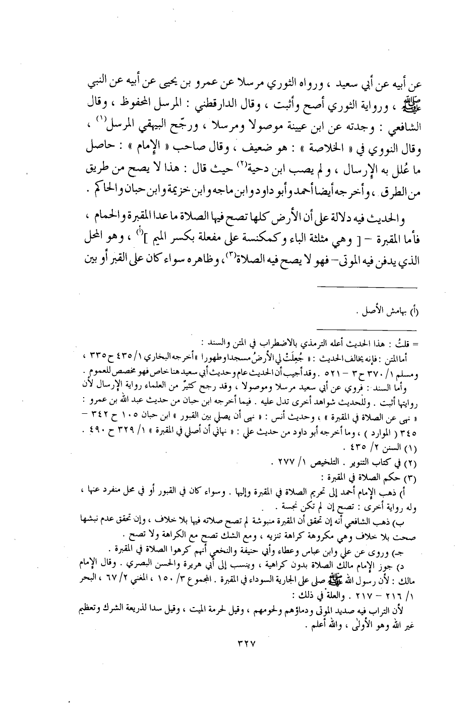 وأما السند: فروي عن أبي سعيد مرسلًا وموصولا، وقد رجح كثير من العلماء رواية الإرسال لأن روايها أثبت. وللحديث شواهد أخرى تدل عليه. فيما أخرجه ابن حبان من حديث عبد الله بن عمرو: "نهى عن الصلاة في المقبرة"، وحديث أنس: "نهي أن يصلي بين القبور" ابن حبان 105 ح 342 - 345) (الموارد)، وط أخرجه أبو داود من حديث علي: "نهاني أن أصلى في المقبرة" 1/ 329 ح 490.
