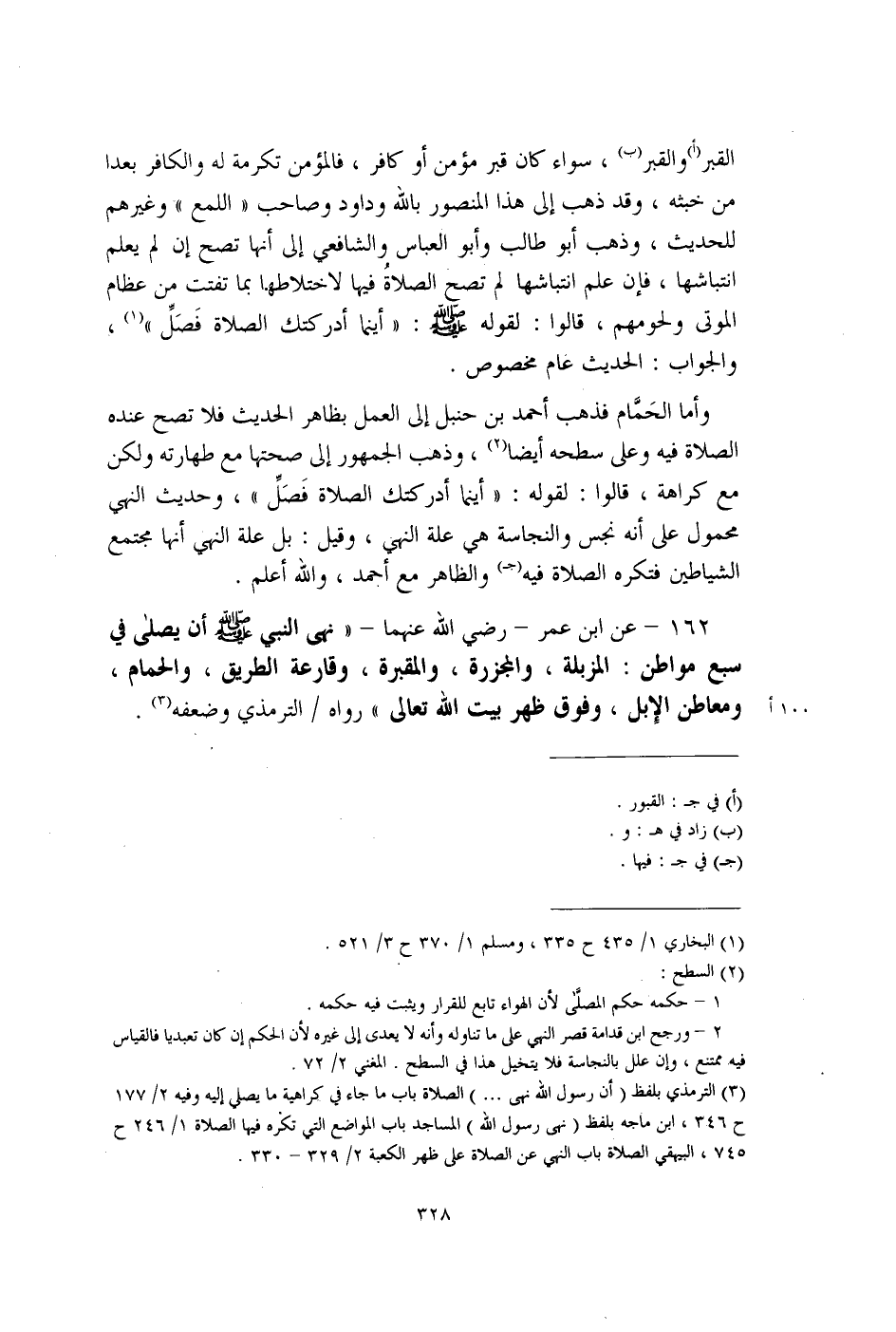 162 - عن ابن عمر - رضي الله عنهما - "نهى النبي - صلى الله عليه وسلم - أن يصلى في سبع مواطن: المزبلة، والمجزرة، والمقبرة، وقارعة الطريق، والحمام، ومعاطن الإِبل، وفوق ظهر بيت الله تعالى" رواه لم الترمذي وضعفه (¬3).