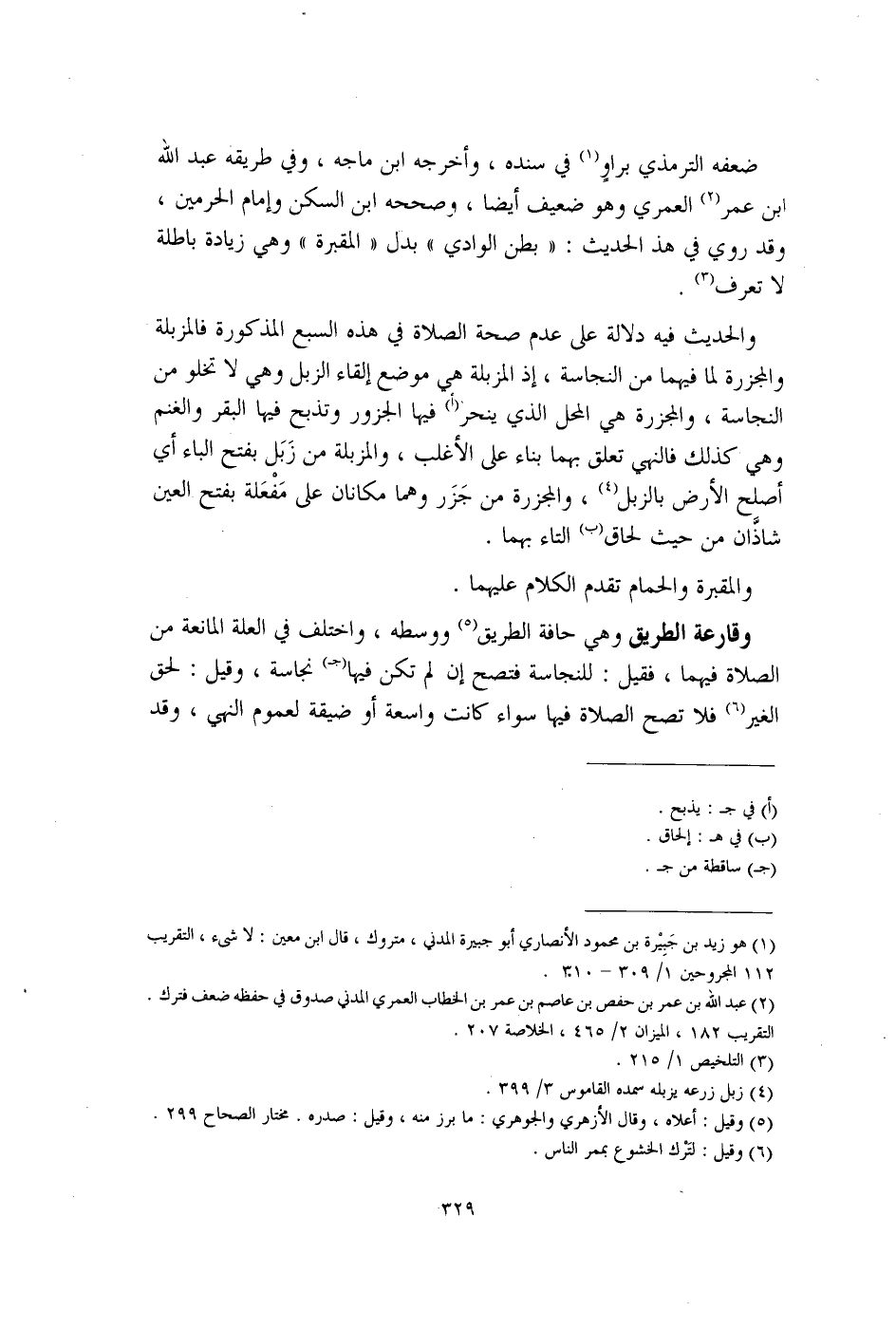 والحديث فيه دلالة على عدم صحة الصلاة في هذه السبع المذكورة فالمزبلة والمجزرة لما فيهما من النجاسة، إذ المزبلة هي موضع إلقاء الزبل وهي لا تخلو من النجاسة، والمجزرة هي المحل الذي ينحر (أ) فيها الجزور وتذبح فيها البقر والغنم وهي كذلك فالنهي تعلق بهما بناء على الأغلب، والمزبلة من زَبَل بفتح الباء أي أصلح الأرض بالزبل (¬4)، والمجزرة من جَزَر وهما مكانان على مَفْعَلة بفتح العين شاذَّان من حيث لحاق (ب) التاء بهما.