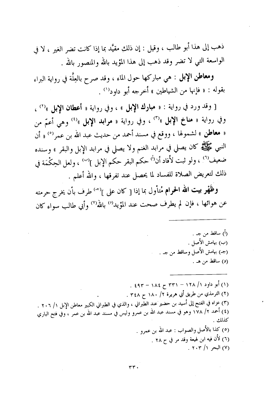 [وقد ورد في رواية: "مبارك الإِبل"، وفي رواية "أعطان الإِبل" (¬2)، وفي رواية "مناخ الإِبل" (¬3)، وفي رواية "مرابد الإِبل" (¬4) وهي أعمّ من "معاطن" لشمولها، ووقع في مسند أحمد من حديث عبد الله بن عمر (¬5) "أن النبي - صلى الله عليه وسلم - كان يصلي في مرابد الغنم ولا يصلي في مرابد الإِبل والبقر" وسنده ضعيف (¬6)، ولو ثبت لأفاد أن (أ) حكم البقر حكم الإِبل] (ب)، ولعل الحِكْمَة في ذلك لتعريض الصلاة للفساد لما يحصل عند تفرقها، والله أعلم.