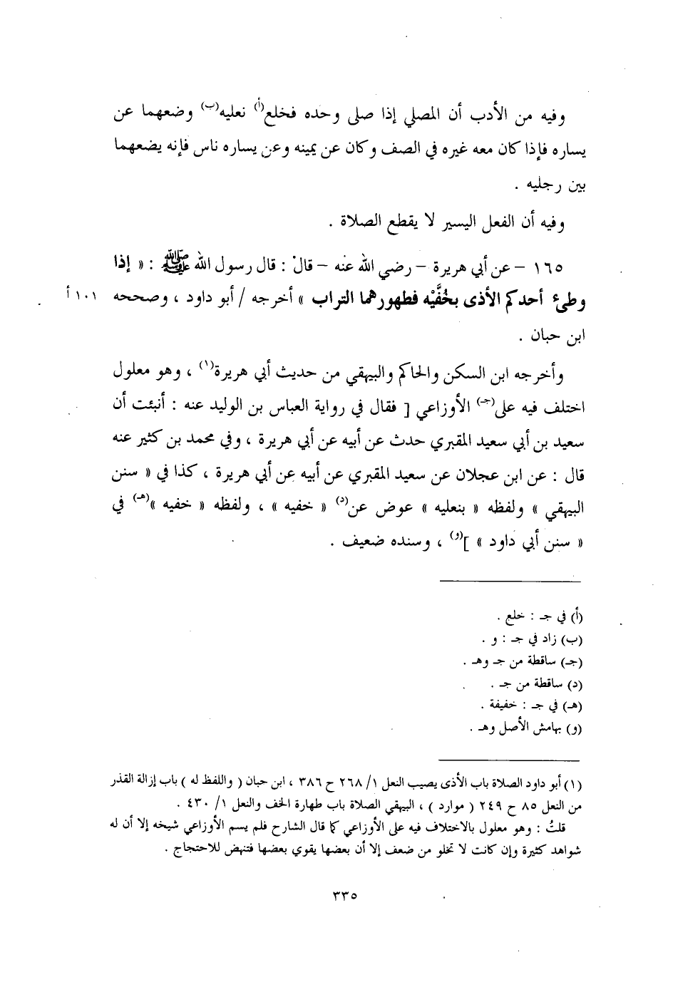 وأخرجه ابن السكن والحاكم والبيهقي من حديث أبي هريرة (¬1)، وهو معلول اختلف فيه على (جـ) الأوزاعي [فقال في رواية العباس بن الوليد عنه: أنبئت أن سعيد بن أبي سعيد المقبري حدث عن أبيه عن أبي هريرة، وفي محمد بن كثير عنه قال: عن ابن عجلان عن سعيد المقبري عن أبيه عن أبي هريرة، كذا في "سنن البيهقي" ولفظه "بنعليه" عوض عن (د) "خفيه"، ولفظه "خفيه" (هـ) في "سنن أبي داود"، (و)، وسنده ضعيف.