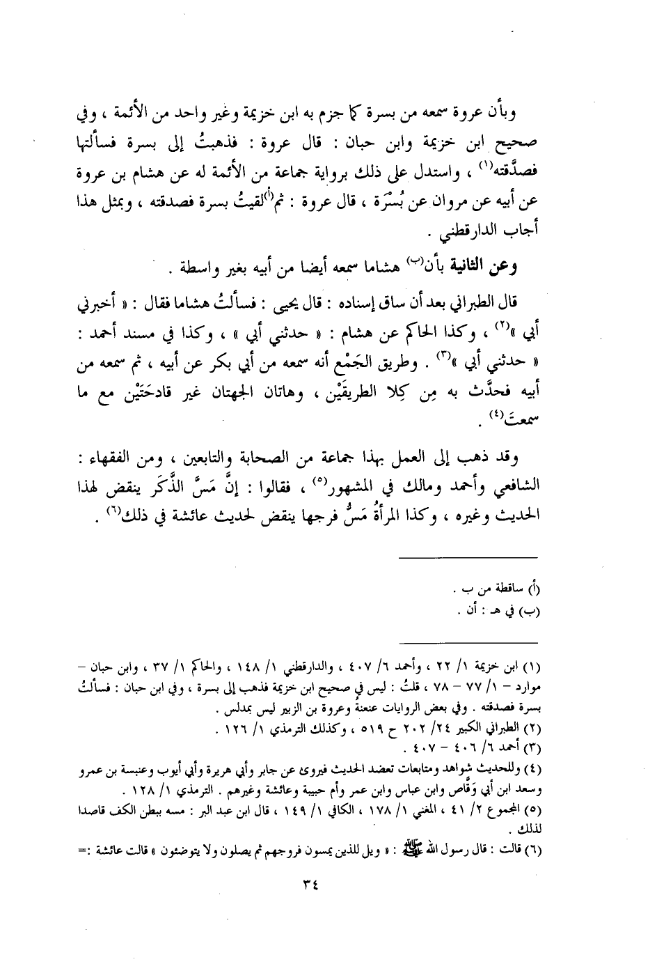(¬1) ابن خزيمة 1/ 22، وأحمد 6/ 407، والدارقطني 1/ 148، والحاكم 1/ 37، وابن حبان- موارد -1/ 77 - 78، قلتُ: ليس في صحيح ابن خزيمة فذهب إلى بسرة، وفي ابن حبان: فسألتُ بسرة فصدقته. وفي بعض الروايات عنعنةُ وعروة بن الزبير ليس بمدلس.