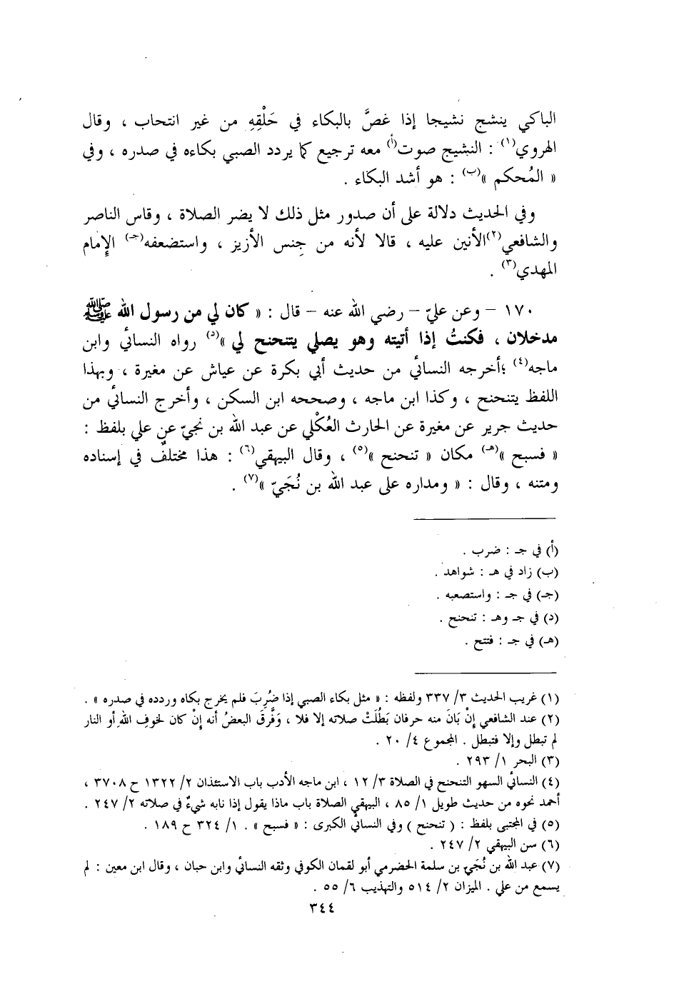 170 - وعن علي - رضي الله عنه - قال: "كان لي من رسول الله - صلى الله عليه وسلم - مدخلان، فكنتُ إذا أتيته وهو يصلي يتنحنح لي" (د) رواه النسائي وابن ماجه (¬4)؛ أخرجه النسائي من حديث أَبى بكرة عن عياش عن مغيرة، وبهذا اللفظ يتنحنح، وكذا ابن ماجه، وصححه ابن السكن، وأخرج النسائي من حديث جرير عن مغيرة عن الحارث العُكْلي عن عبد الله بن نجيّ عن علي بلفظ: "فسبح" (هـ) مكان "تنحنح" (¬5)، وقال البيهقي (¬6): هذا مختلفٌ في إسناده ومتنه، وقال: "ومداره على عبد الله بن نُجَيّ" (¬7).