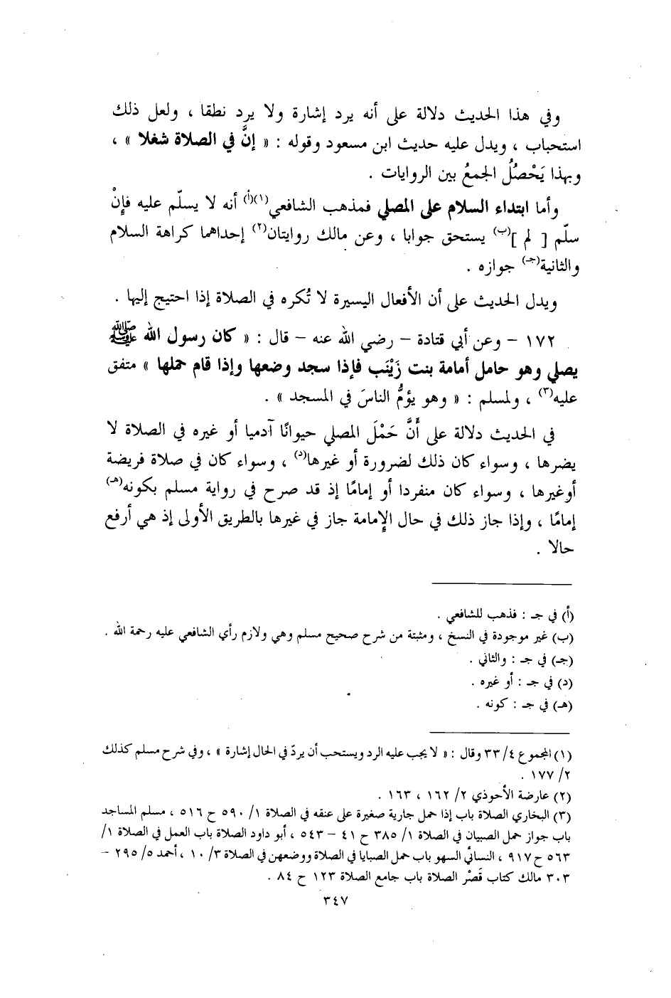 (¬3) البخاري الصلاة باب إذا حمل جارية صغيرة على عنقه في الصلاة 1/ 590 ح 516، مسلم المساجد باب جواز حمل الصبيان في الصلاة 1/ 385 ح 41 - 543، أبو داود الصلاة باب العمل في الصلاة 1/ 563 ح 917، النسائي السهو باب حمل الصبايا في الصلاة ووضعهن في الصلاة 3/ 10، أحمد 5/ 295 - 303 مالك كتاب قَصْر الصلاة باب جامع الصلاة 123 ح 84.