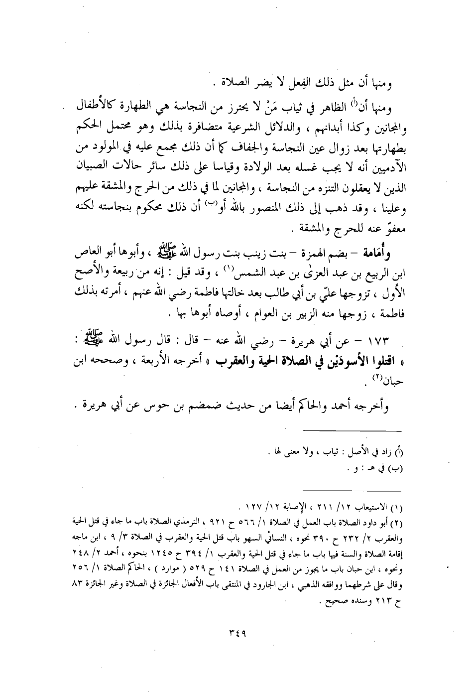 173 - عن أبي هريرة - رضي الله عنه - قال: قال رسول الله - صلى الله عليه وسلم -: "اقتلوا الأسودَيْن في الصلاة الحية والعقرب" أخرجه الأربعة، وصححه ابن حبان (¬2).