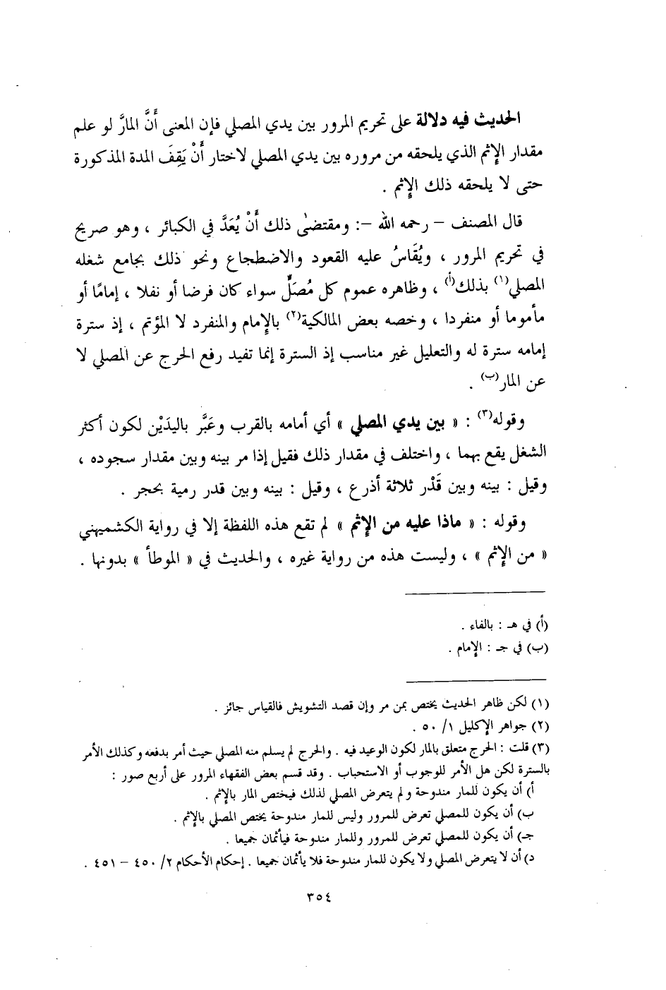 د) أن لا يتعرض المصلي ولا يكون للمار مندوحة فلا يأثمان جميعا. إحكام الأحكام 2/ 450 - 451.