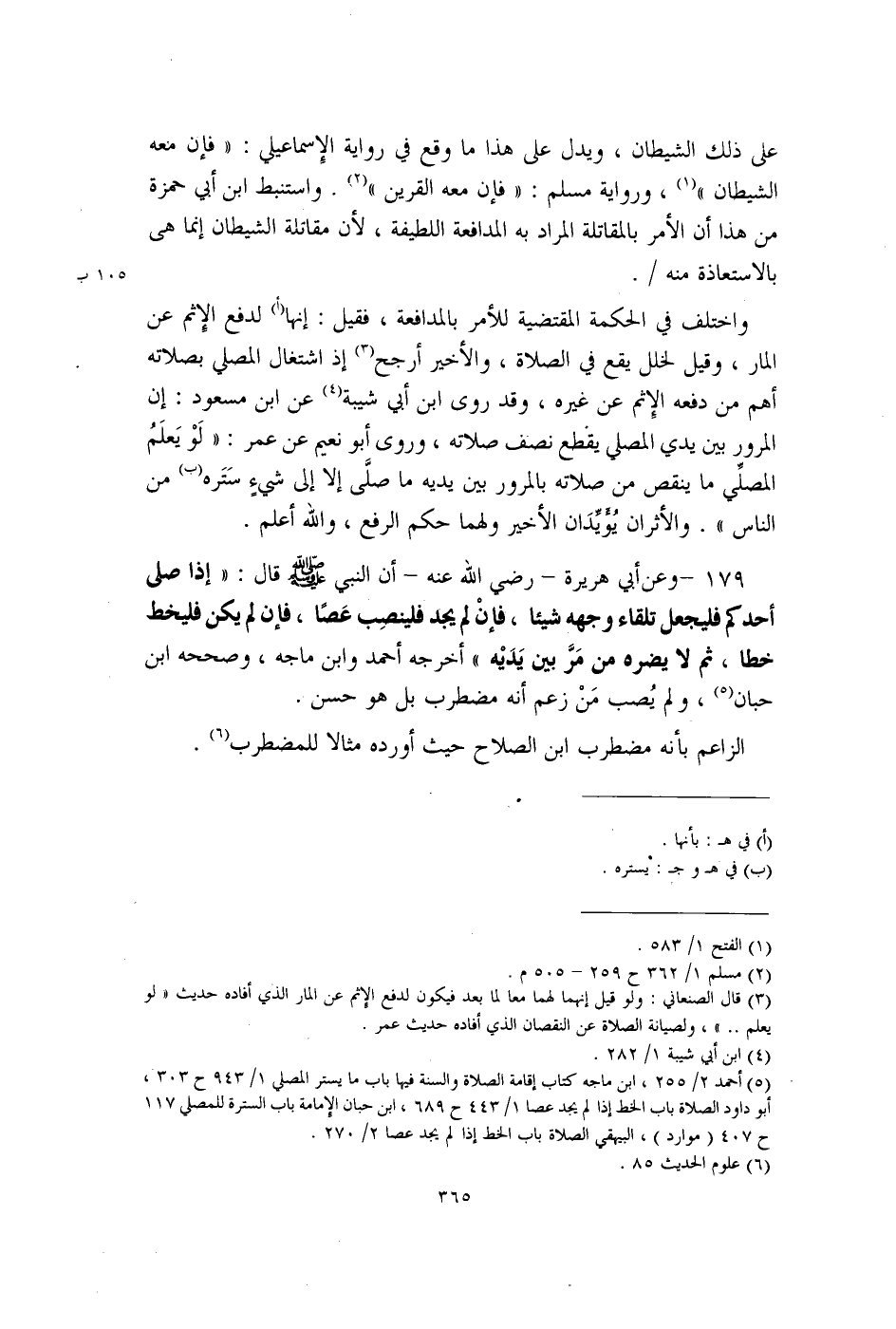179 - وعن أَبي هريرة - رضي الله عنه - أن النبي - صلى الله عليه وسلم - قال: "إذا صلى أحدكم فليجعل تلقاء وجهه شيئًا، فإنْ لم يجد فلينصِب عَصًا، فإن لم يكن فليخط خطا، ثم لا يضره من مَرَّ بين يَدَيْه" أخرجه أحمد وابن ماجه، وصححه ابن حبان (¬5)، ولم يُصب مَنْ زعم أنه مضطرب بل هو حسن.