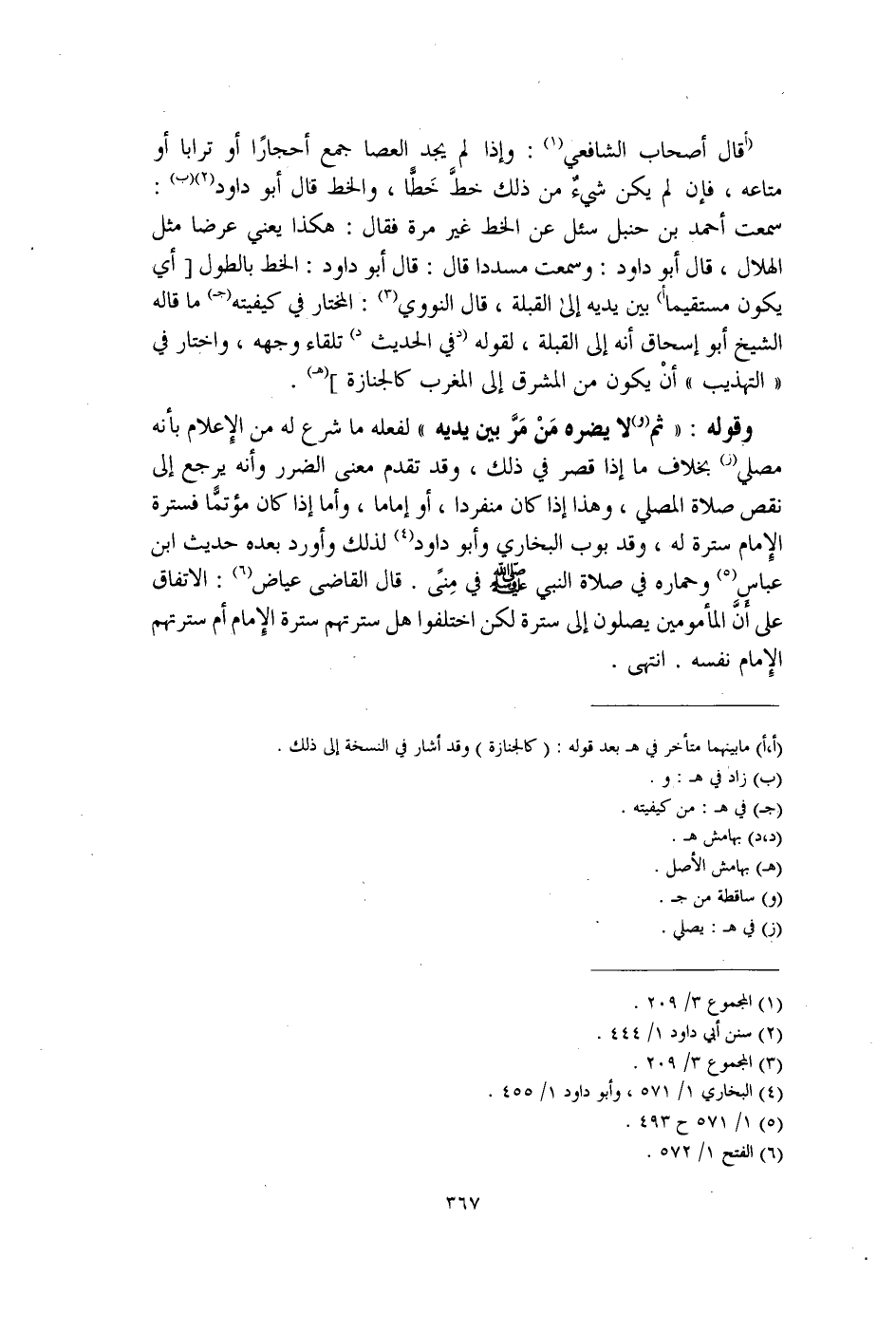 (أقال أصحاب الشافعي (¬1): وإذا لم يجد العصا جمع أحجارًا أو ترابا أو متاعه، فإن لم يكن شيءٌ من ذلك خطَّ خَطًّا، والخط قال أبو داود (¬2) (ب): سمعت أحمد بن حنبل سئل عن الخط غير مرة فقال: هكذا يعني عرضا مثل الهلال، قال أبو داود: وسمعت مسددا قال: قال أبو داود: الخط بالطول [أي يكون مستقيما أ) بين يديه إلى القبلة، قال النووي (¬3): المختار في كيفيته (جـ) ما قاله الشيخ أبو إسحاق أنه إلى القبلة، لقوله (د في الحديث د) تلقاء وجهه، واختار في "التهذيب" أنْ يكون من المشرق إلى المغرب كالجنازة] (هـ).