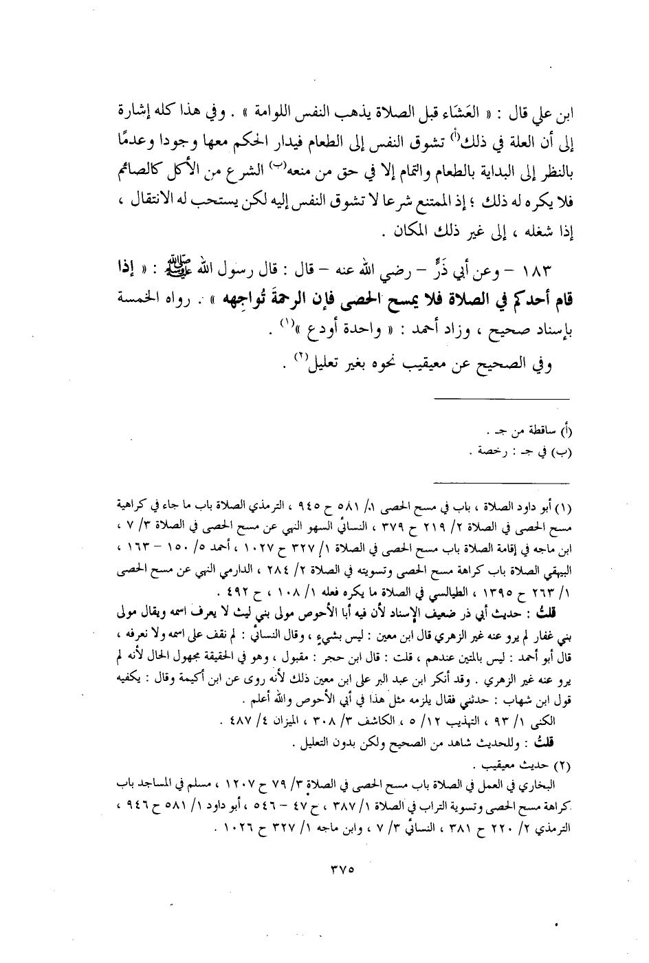 183 - وعن أبي ذَرٍّ - رضي الله عنه - قال: قال رسول الله - صلى الله عليه وسلم -: "إذا قام أحدكم في الصلاة فلا يمسح الحصى فإن الرحمةَ تُواجِهه". رواه الخمسة بإسناد صحيح، وزاد أحمد: "واحدة أودع" (¬1).