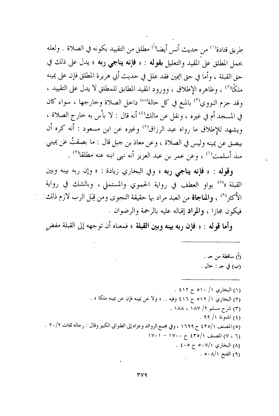 وقوله: "فإنه يناجي ربه" وفي البخاري زيادة: "وإن ربه بينه وبين القبلة" (¬8) بواو العطف في رواية الحموي والمستملي، وبالشك في رواية الأكثر (¬9)، والمناجاة من العبد مراد بها حقيقة النجوى ومن قِبَل الرب لازم ذلك فيكون مجازا، والمراد إقباله عليه بالرحمة والرضوان.