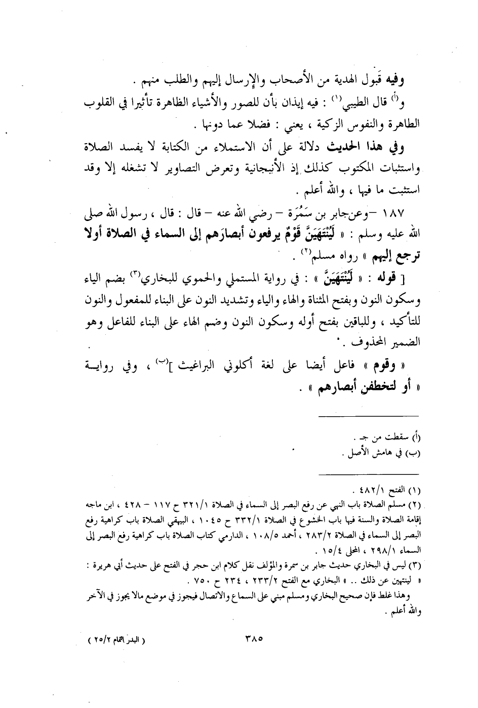 (¬3) ليس في البخاري حديث جابر بن سمرة والمؤلف نقل كلام ابن حجر في الفتح على حديث أبي هريرة: "لينتهين عن ذلك. ." البخاري مع الفتح 2/ 233، 234 ح 750.