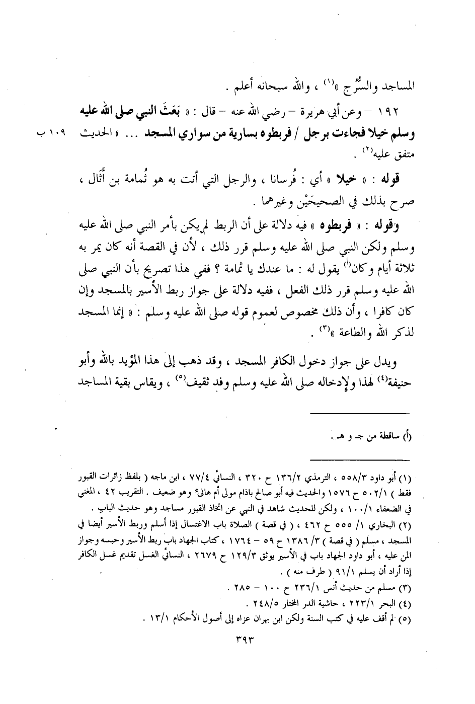 192 - وعن أبي هريرة - رضي الله عنه - قال: "بَعَثَ النبي صلى الله عليه وسلم خيلا فجاءت برجل فربطوه بسارية من سواري المسجد. . ." الحديث متفق عليه (¬2).