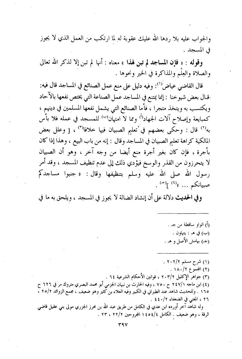 قال القاضي عياض (¬1): وفيه دليل على منع عمل الصنائع في المساجد قال فيه: قال بعض شيوخنا: إنما يمتنع في المساجد عمل الصناعة التي يختص نفعها بالآحاد ويكتسب به ويتخذ متجرا، فأما الصنائع التي يشمل نفعها المسلمين في دينهم، كمبايعة وإصلاح آلات الجهاد (أ) ومما لا امتهان (ب) للمسجد في عمله فلا بأس به (¬2) قال: وحكى بعضهم في تعليم الصبيان فيها خلافا (¬3)، [وعلل بعض المالكية كراهة تعليم الصبيان في المساجد وقال: إنه من باب البيع، وهذا إذا كان بأجرة، فإن كان بغير أجرة منع أيضًا من وجه آخر، وهو أن الصبيان لا يتحرزون من القذر والوسخ فيؤدي ذلك إلي عدم تنظيف المسجد، وقد أمر رسول الله صلى الله عليه وسلم بتنظيفها وقال: "جنبوا مساجدكم صبيانكم. . ." (¬4)] (جـ).