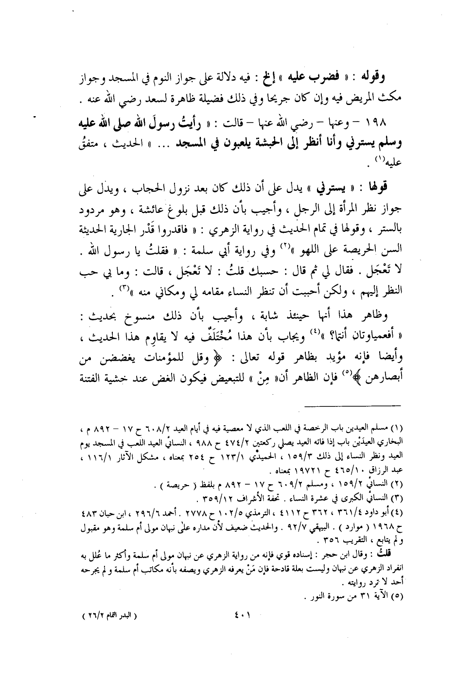198 - وعنها - رضي الله عنه - قالت: "رأيتُ رسول صلى الله عليه وسلم يسترني وأنا أنظر إلى الحبشة يلعبون في المسجد. . ." الحديث، متفقُ عليه (¬1).