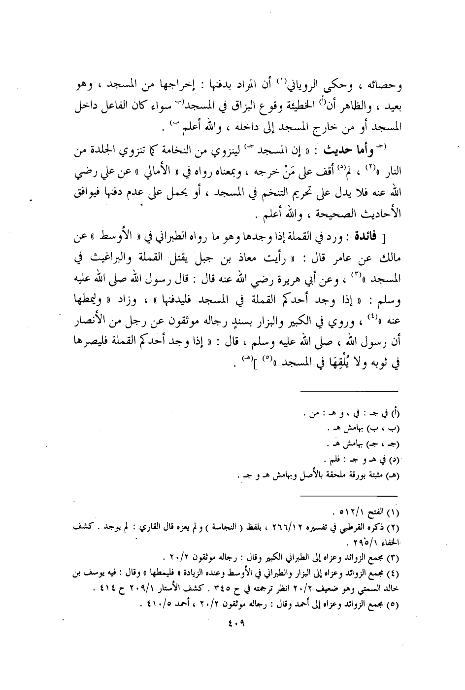 (جـ وأما حديث: "إن المسجد جـ) لينزوي من النخامة كما تنزوي الجلدة من النار" (¬2)، لم (د) أقف على مَنْ خرجه، وبمعناه رواه في "الأمالي" عن علي رضي الله عنه فلا يدل على تحريم التنخم في المسجد، أو يحمل على عدم دفنها فيوافق الأحاديث الصحيحة، والله أعلم.