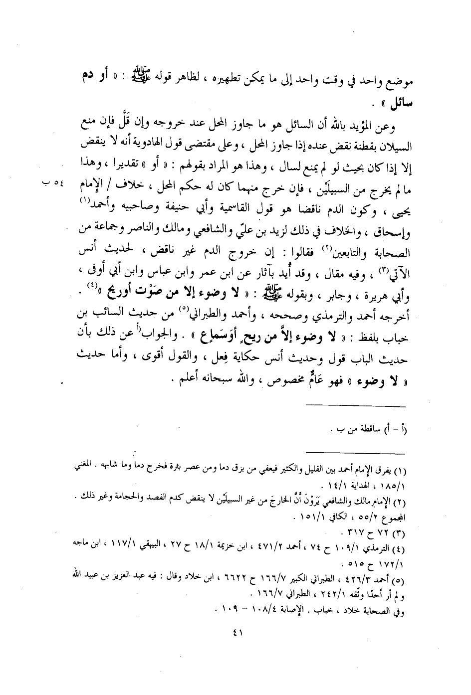 وعن المؤيد بالله أن السائل هو ما جاوز المحل عند خروجه وإن قَلَّ فإن منع السيلان بقطنة نقض عنده إذا جاوز المحل، وعلى مقتضى قول الهادوية أنه لا ينقض إلا إذا كان بحيث لو لم يمنع لسال، وهذا هو المراد بقولهم: "أو" تقديرا، وهذا ما لم يخرج من السبيلَيْن، فإن خرج منهما كان له حكم المحل، خلاف الإِمام يحيى، وكون الدم ناقضا هو قول القاسمية وأبي حنيفة وصاحبيه وأحمد (¬1) وإسحاق، والخلاف في ذلك لزيد بن عليّ والشافعي ومالك والناصر وجماعة من الصحابة والتابعين (¬2) فقالوا: إن خروج الدم غير ناقض، لحديث أنس الآتي (¬3)، وفيه مقال، وقد أُيد بآثار عن ابن عمر وابن عباس وابن أبي أوفى، وأبي هريرة، وجابر، وبقوله - صلى الله عليه وسلم -: "لا وضوء إلا من صَوْت أو ريح" (¬4). أخرجه أحمد والترمذي وصححه، وأحمد والطبراني (¬5) من حديث السائب بن خباب بلفظ: "لا وضوء إلَّا من ريحٍ أوَ سَماعٍ". والجواب (أعن ذلك بأن حديث الباب قول وحديث أنس حكاية فِعل، والقول أقوى، وأما حديث "لا وضوء" فهو عَامٌّ مخصوص، والله سبحانه أعلم.