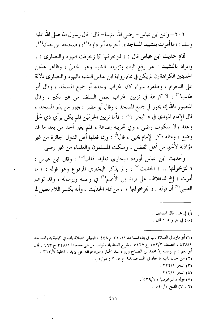 تمام حديث ابن عباس قال: "لتزخرفنها كما زخرفت اليهود والنصارى"، والمراد بالتشييد: هو رفع البناء وتزيينه بالشيد وهو الجصّ، وظاهر هذين الحديثين الكراهة إن لم يكن في تمام رواية ابن عباس التشبه باليهود والنصارى دلالة على التحريم، وظاهره سواء كان المحراب وحده أو جميع المسجد، وقال أبو طالب (¬3): لا كراهة في تزيين المحراب لعمل السلف من غير نكير، وقال المنصور بالله إنه يجوز في جميع المسجد، وقال أبو مضر: يجوز من بذر المسجد، قال الإِمام المهدي في "البحر" (¬4): فأما تزيين الحرمَيْن فلم يكن برأي ذي حَلّ وعقد ولا سكوت رضي، وفي تخريبه إضاعة، فلم يغير أحد من بعد ما قد وضع، ومثله ذكر الإِمام يحيى، قال (أ): وإنما فعلها أهل الدول الجائرة من غير مؤاذنة لأَحدٍ من أهل الفضل، وسكت المسلمون والعلماء من غير رضي.