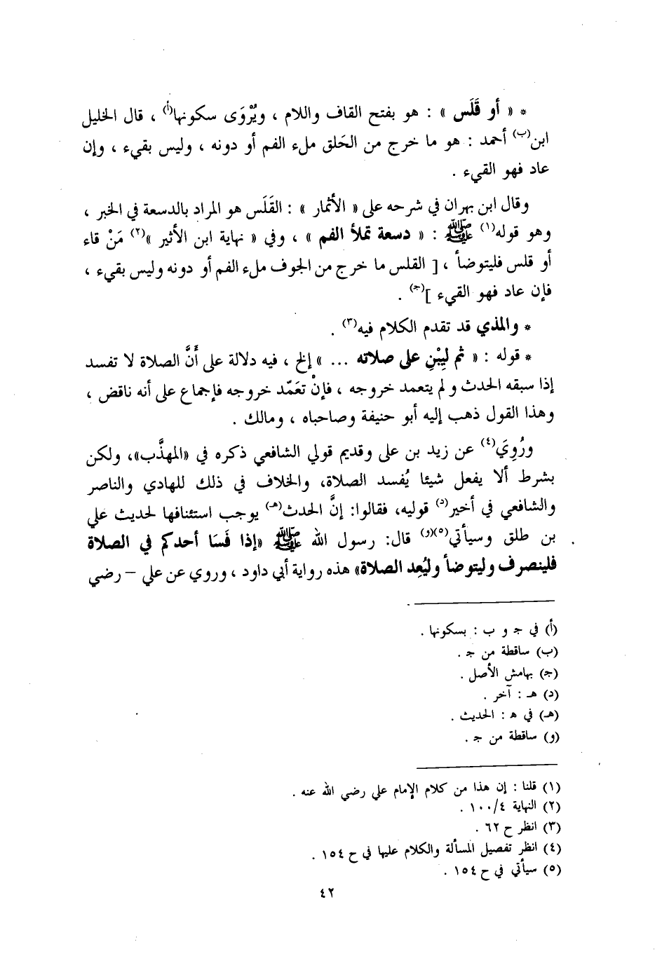 * "أو قَلَس": هو بفتح القاف واللام، ويُروَى سكونها (أ)، قال الخليل بن (ب) أحمد: هو ما خرج من الحَلق ملء الفم أو دونه، وليس بقيء، وإن عاد فهو القيء.