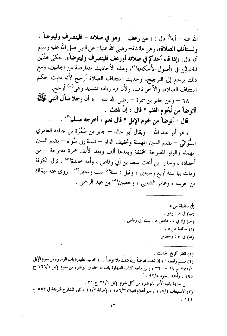 (¬2) مسلم ولفظه: "إن شئت فتوضأ وإن شئت فلا توضأ. ." كتاب الطهارة باب الوضوء من لحوم الإبل 1/ 275 ح 97 - 360، وابن ماجه كتاب الطهارة باب ما جاء في الوضوء من لحوم الإبل 1/ 166 ح 495، وأحمد بنحوه 5/ 92.