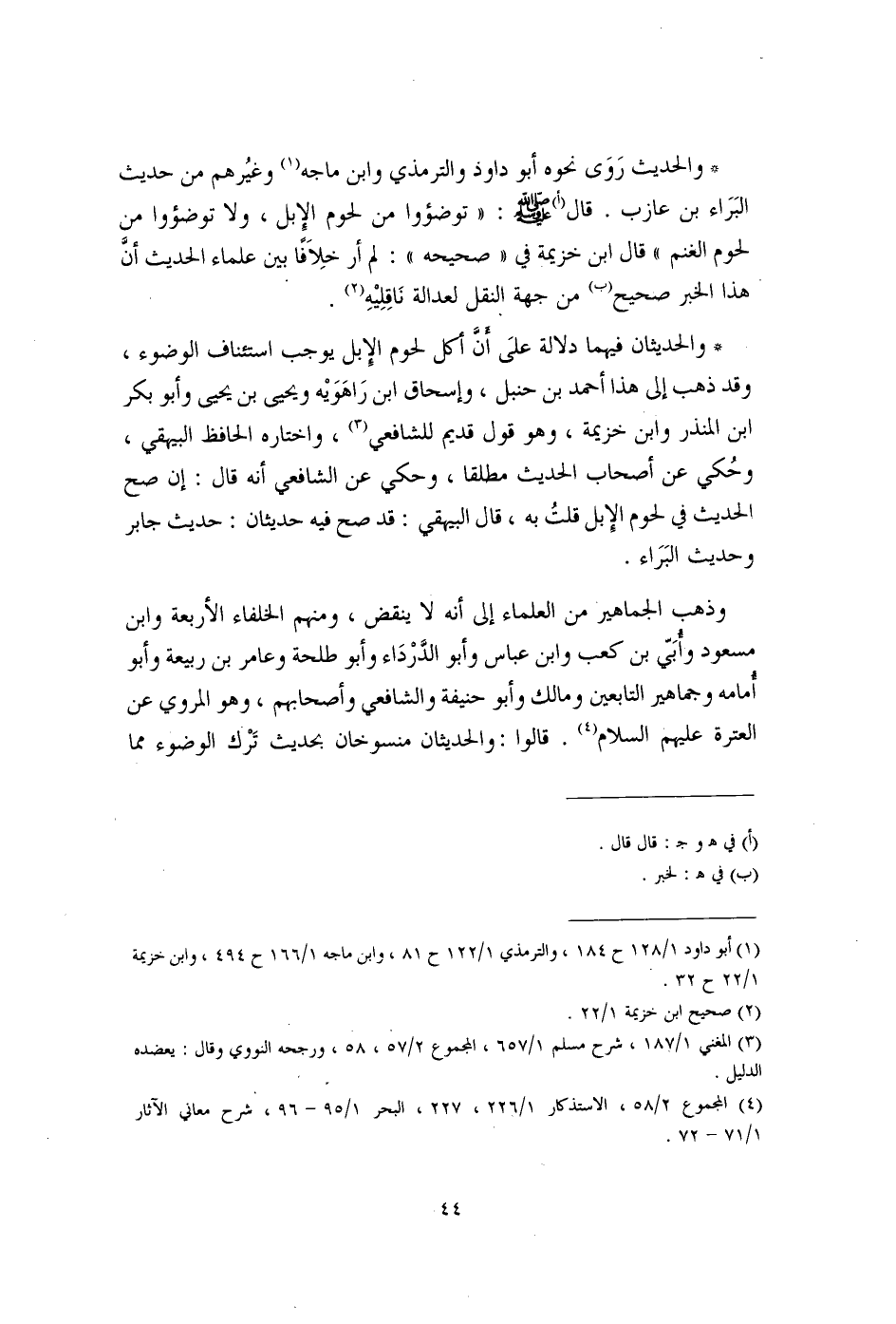 * والحديث رَوَى نحوه أبو داود والترمذي وابن ماجه (¬1) وغيُرهم من حديث البَرَاء بن عازب. قال (أ) - صلى الله عليه وسلم -: "توضؤوا من لحوم الإِبل، ولا توضؤوا من لحوم الغنم" قال ابن خزيمة في "صحيحه": لم أر خلِافًا بين علماء الحديث أنَّ هذا الخبر صحيح (ب) من جهة النقل لعدالة نَاقِلِيْهِ (¬2).