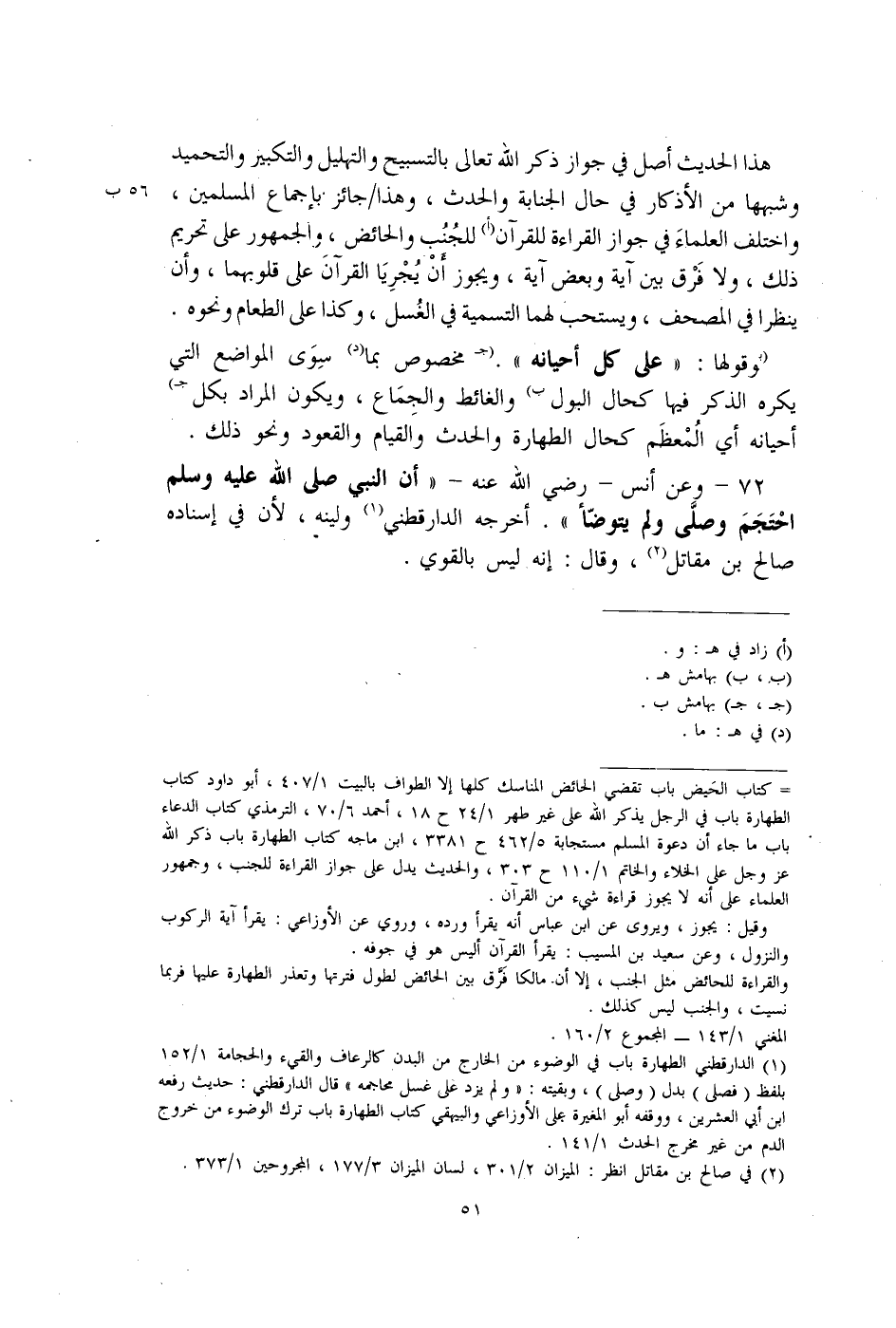 = كتاب الحَيض باب تقضي الحائض المناسك كلها إلا الطواف بالبيت 1/ 407، أبو داود كتاب الطهارة باب في الرجل يذكر الله على غير طهر 1/ 24 ح 18، أحمد 6/ 70، الترمذي كتاب الدعاء باب ما جاء أن دعوة المسلم مستجابة 5/ 462 ح 3381، ابن ماجه كتاب الطهارة باب ذكر الله عزَّ وجلَّ على الخلاء والخاتم 1/ 110 ح 303، والحديث يدل على جواز القراءة للجنب، وجمهور العلماء على أنه لا يجوز قراءة شيء من القرآن.