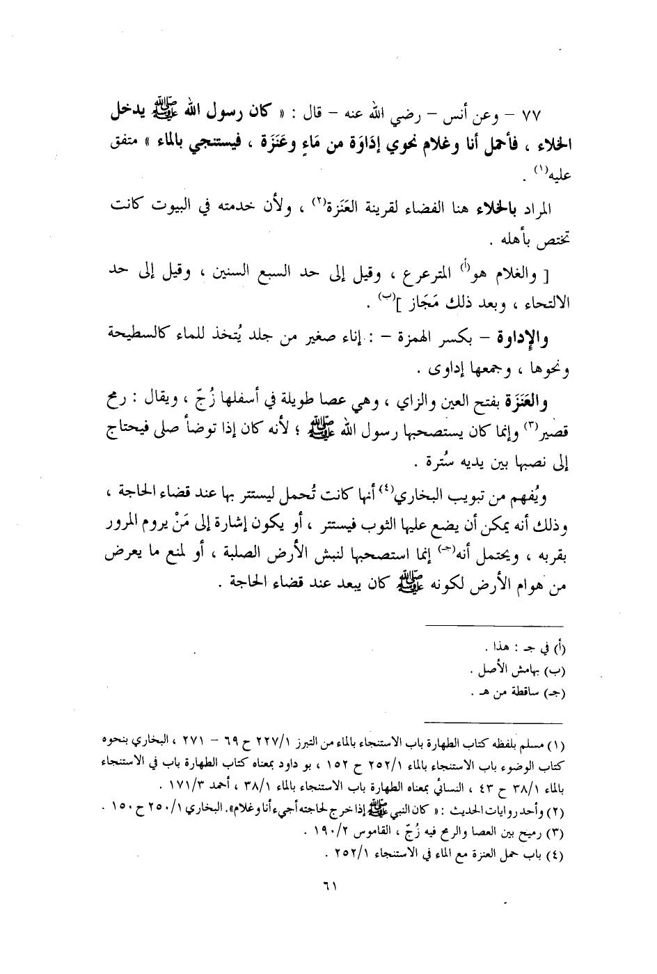(¬2) وأحد روايات الحديث: "كان النبي - صلى الله عليه وسلم - إذا خرج لحاجته أجيء أنا وغلام". البخاري 1/ 250 ح 150.