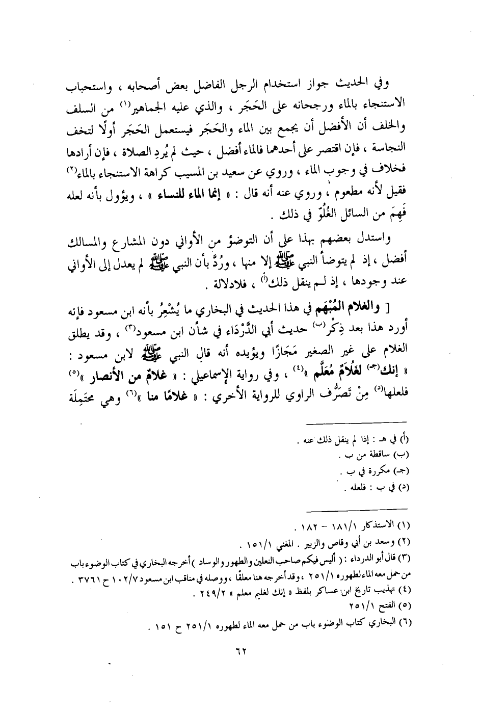 (¬6) البخاري كتاب الوضوء باب من حمل معه الماء لطهوره 1/ 251 ح 151.