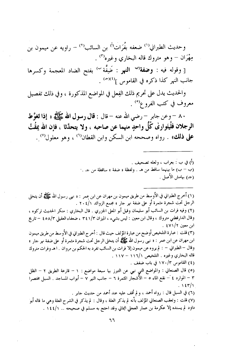 (¬3) قلت: عبارة التلخيص أوضح من عبارة المؤلف حيث قال: أخرج الطبراني في الأوسط من طريق ميمون بن مهران عن ابن عمر: "نهى رسول الله - صلى الله عليه وسلم - أن يتخلى الرجل تحت شجرة مثمرة أو على ضفة نهر جار" وقال -الطبراني-: لم يروه عن ميمون إلا فرات بن السائب تفرد به الحكم بن مروان. اهـ وفرات متروك قاله البخاري وغيره. التلخيص 1/ 116 - 117.