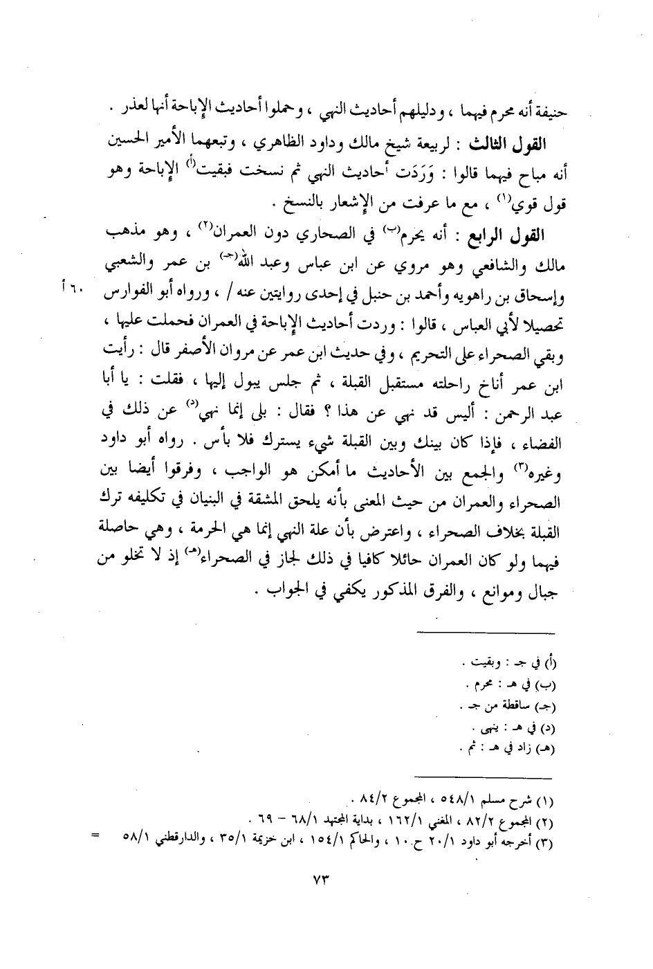 القول الرابع: أنه يحرم (ب) في الصحاري دون العمران (¬2)، وهو مذهب مالك والشافعي وهو مروي عن ابن عباس وعبد الله (جـ) بن عمر والشعبي وإسحاق بن راهويه وأحمد بن حنبل في إحدى روايتين عنه، ورواه أبو الفوارس تحصيلا لأبي العباس، قالوا: وردت أحاديث الإِباحة في العمران فحملت عليها، وبقي الصحراء على التحريم، وفي حديث ابن عمر عن مروان الأصفر قال: رأيت ابن عمر أناخ راحلته مستقبل القبلة، ثم جلس يبول إليها، فقلت: يا أبا عبد الرحمن: أليس قد نهي عن هذا؟ فقال: بلى إنما نهي (د) عن ذلك في الفضاء، فإذا كان بينك وبين القبلة شيء يسترك فلا بأس. رواه أبو داود وغيره (¬3) والجمع بين الأحاديث ما أمكن هو الواجب، وفرقوا أيضًا بين الصحراء والعمران من حيث المعنى بأنه يلحق المشقة في البنيان في تكليفه ترك القبلة بخلاف الصحراء، واعترض بأن علة النهي إنما هي الحرمة، وهي حاصلة فيهما ولو كان العمران حائلا كافيا في ذلك لجاز في الصحراء (هـ) إذ لا تخلو من جبال وموانع، والفرق المذكور يكفي في الجواب.