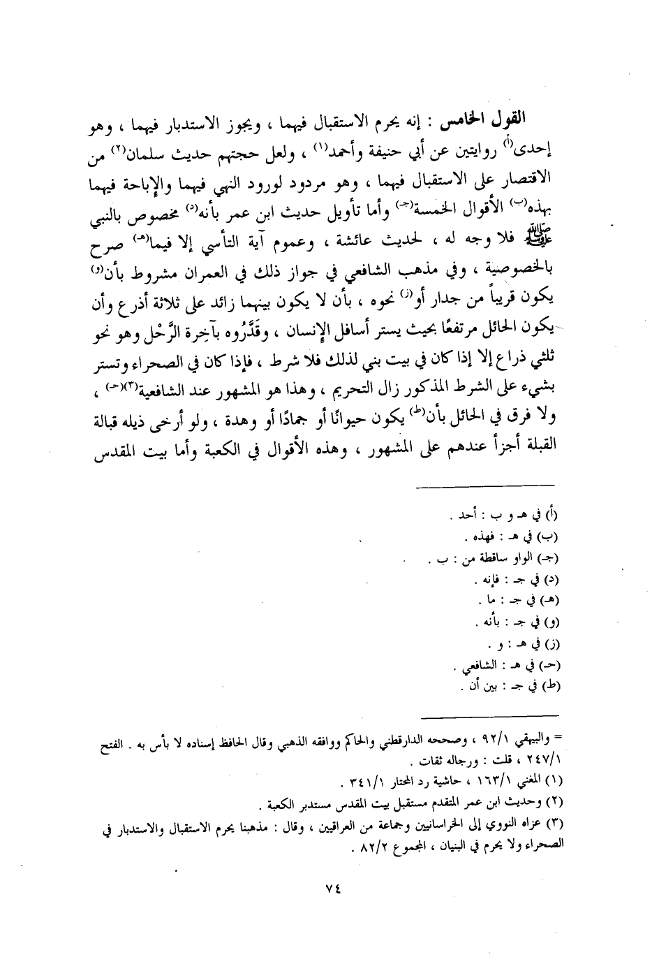 القول الخامس: إنه يحرم الاستقبال فيهما، ويجوز الاستدبار فيهما، وهو إحدى (أ) روايتين عن أبي حنيفة وأحمد (¬1)، ولعل حجتهم حديث سلمان (¬2) من الاقتصار على الاستقبال فيهما، وهو مردود لورود النهي فيهما والإباحة فيهما بهذه (ب) الأقوال الخمسة (جـ) وأما تأويل حديث ابن عمر بأنه (د) مخصوص بالنبي - صلى الله عليه وسلم - فلا وجه له، لحديث عائشة، وعموم آية التأسي إلا فيما (هـ) صرح بالخصوصية، وفي مذهب الشافعي في جواز ذلك في العمران مشروط بأن (و) يكون قريبًا من جدار أو (ز) نحوه، بأن لا يكون بينهما زائد على ثلاثة أذرع وأن يكون الحائل مرتفعًا بحيث يستر أسافل الإِنسان، وقَدَّرُوه بآخِرة الرَّحْل وهو نحو ثلثي ذراع إلا إذا كان في بيت بني لذلك فلا شرط، فإذا كان في الصحراء وتستر بشيء على الشرط المذكور زال التحريم، وهذا هو المشهور عند الشافعية (¬3) (ح)، ولا فرق في الحائل بأن (ط) يكون حيوانًا أو جمادًا أو وهدة، ولو أرخى ذيله قبالة القبلة أجزأ عندهم على المشهور، وهذه الأقوال في الكعبة وأما بيت المقدس