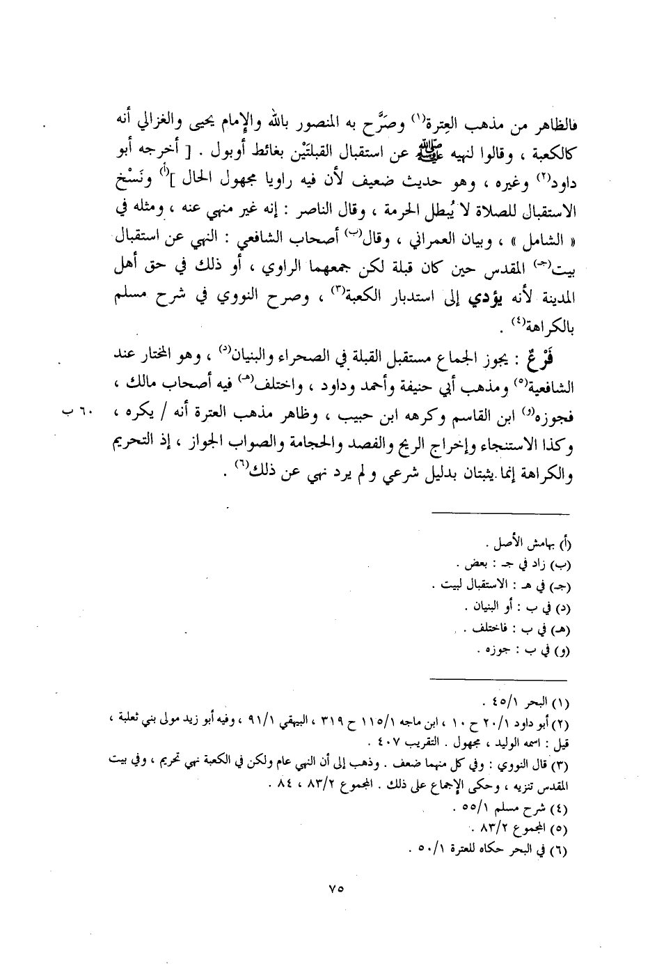(¬3) قال النووي: وفي كل منهما ضعف. وذهب إلى أن النهي عام ولكن في الكعبة نهي تحريم، وفي بيت المقدس تنزيه، وحكى الإجماع على ذلك. المجموع 2/ 83، 84.