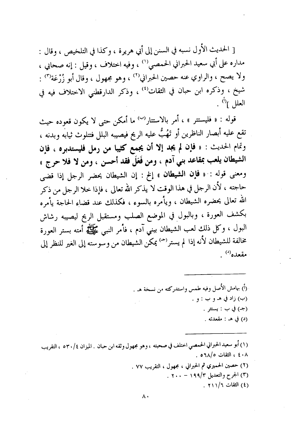 [الحديث الأول نسبه في السنن إلى أبي هريرة، وكذا في التلخيص، وقال: مداره على أبي سعيد الحبراني الحمصي (¬1)، وفيه اختلاف، وقيل: إنه صحابي، ولا يصح، والراوي عنه حصين الحبراني (¬2)، وهو مجهول، وقال أبو زُرْعَة (¬3): شيخ، وذكره ابن حبان في الثقات (¬4)، وذكر الدارقطني الاختلاف فيه في العلل] (أ).